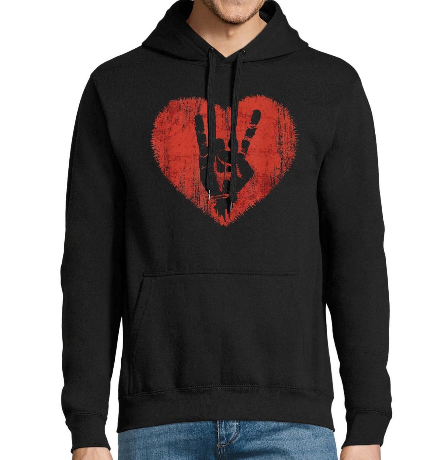 Pánská mikina Srdce Rockera. Originální motiv spojuje energii hudby a emoce do jednoho silného symbolu. Dominantní červené srdce s drsnou, „sprejovou“ texturou vytváří výrazné pozadí pro ikonické gesto ruky ve stylu rock and roll. Kontrast černé siluety a rudého srdce působí syrově, odvážně a zároveň vášnivě.