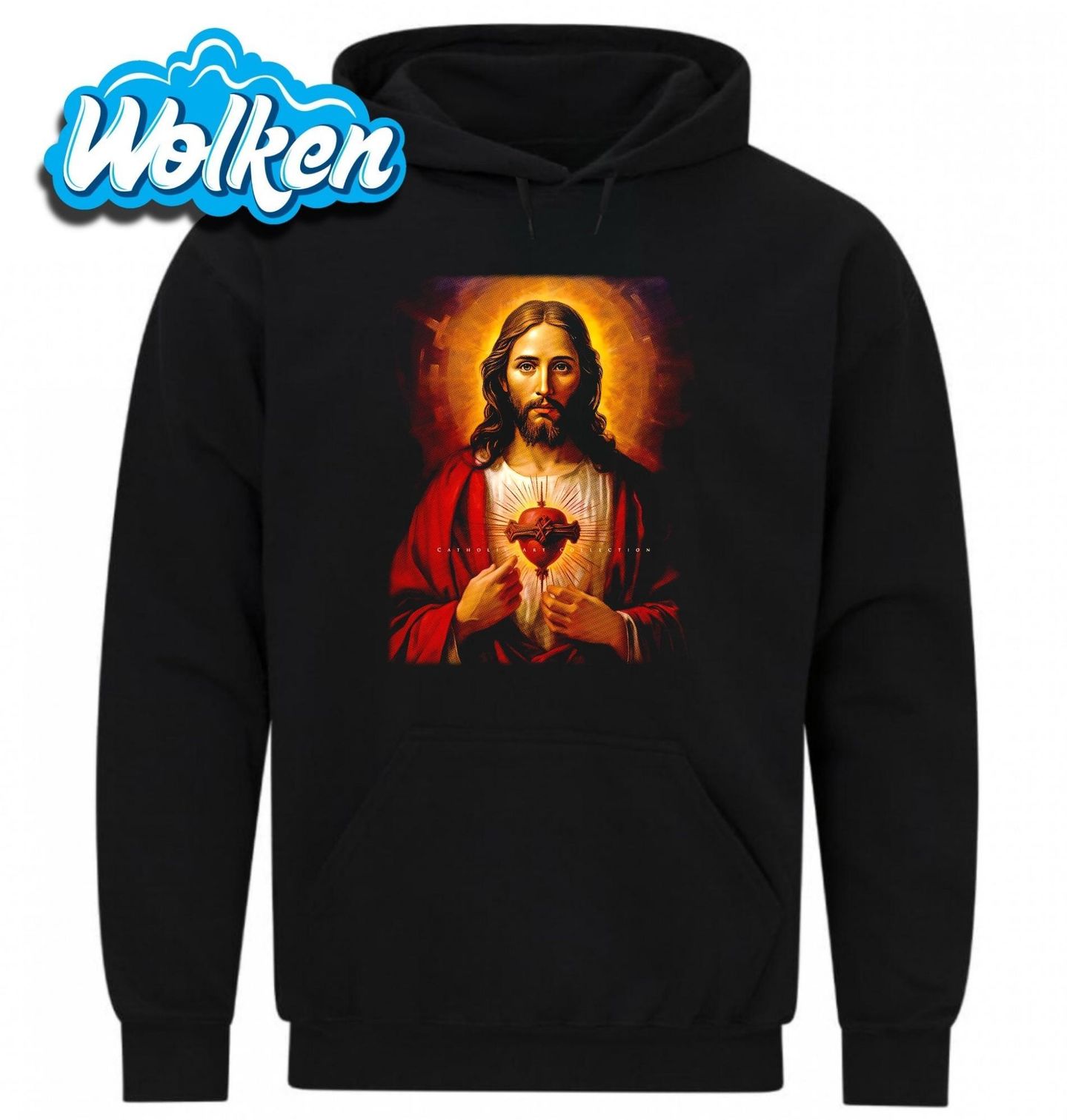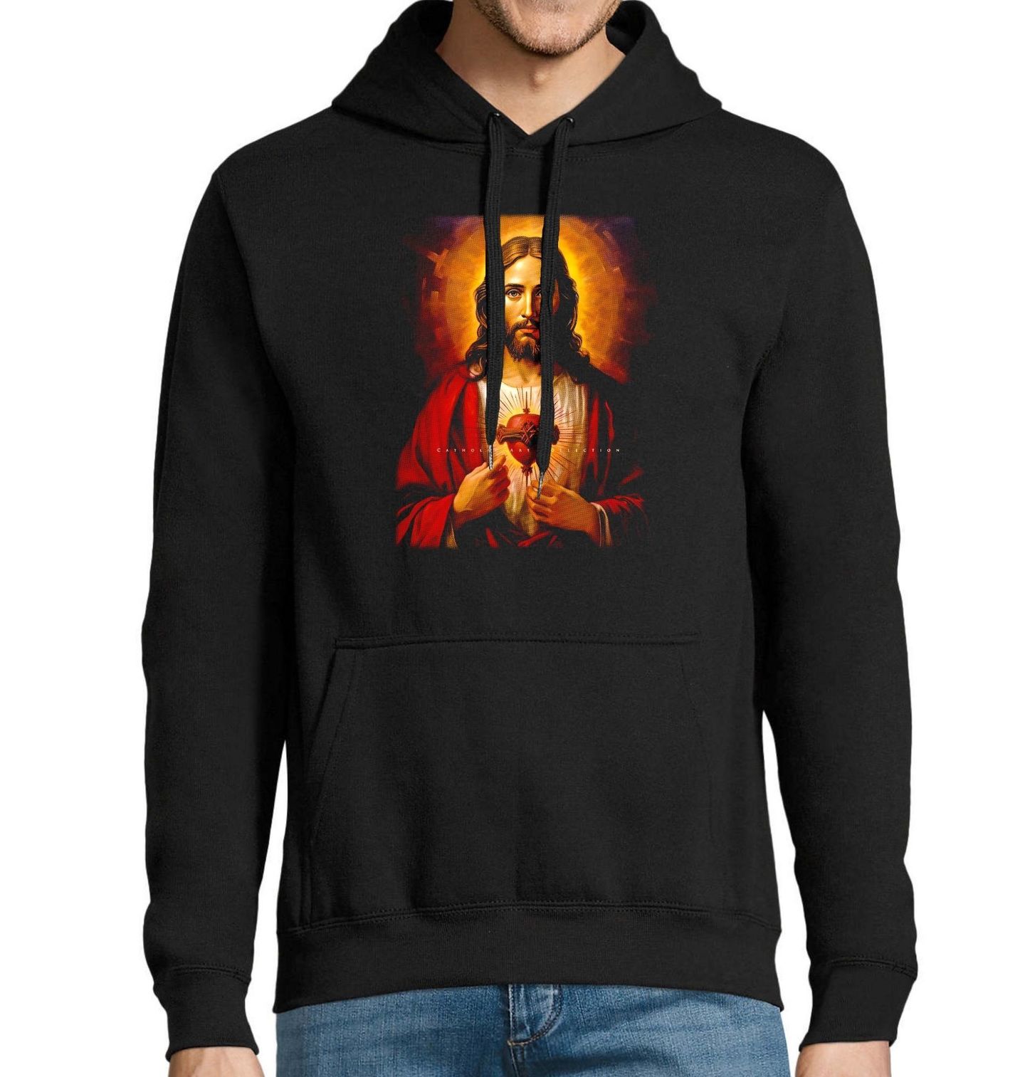 Pánská mikina Srdce Spasitele. Ježíš Kristus s planoucím Svatým Srdcem na hrudi je symbolem lásky, odpuštění a duchovního světla. Tento motiv připomíná víru jako cestu plnou naděje, vnitřní síly a lidskosti. Ideální pro ty, kdo vnímají víru nejen jako symbol, ale jako sílu, která hřeje zevnitř.