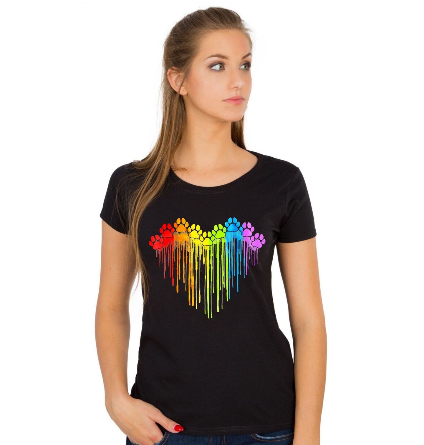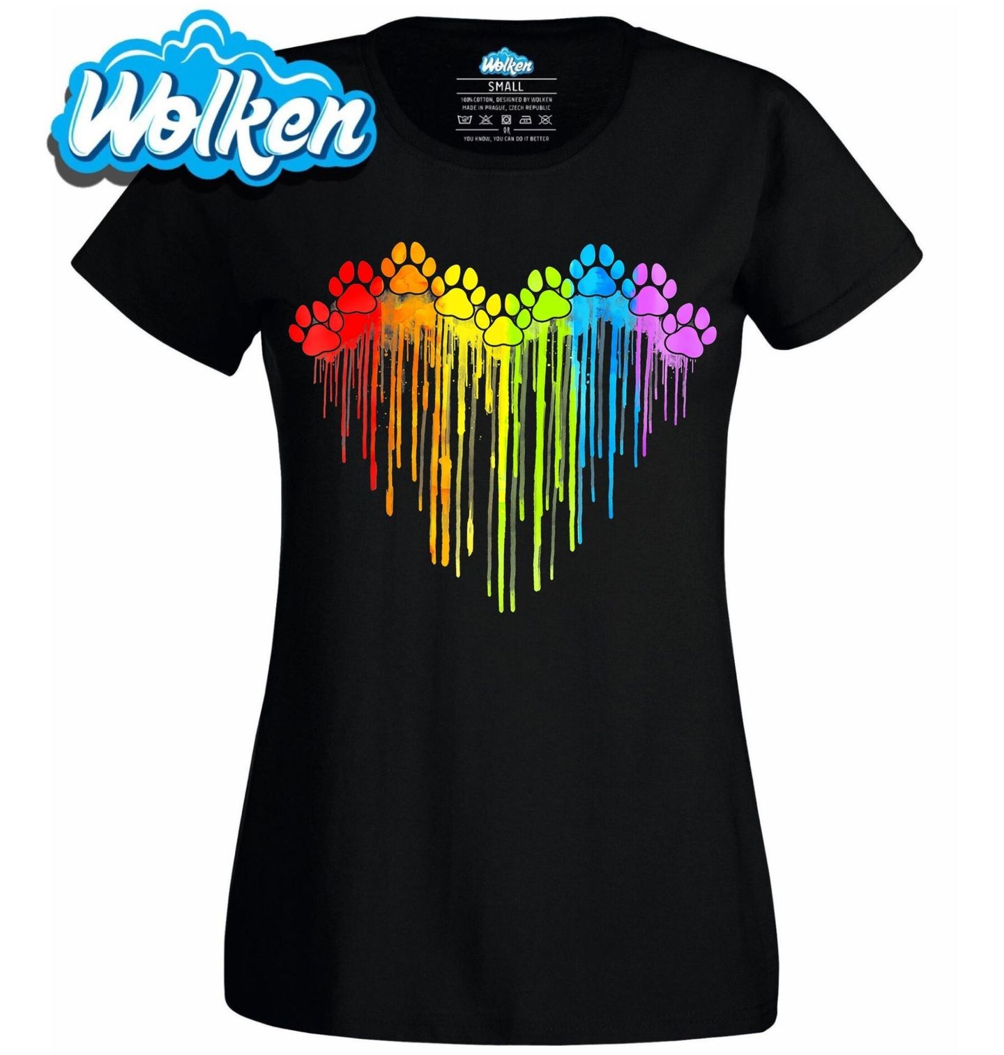Dámské tričko Srdce z Duhových Tlapek. Tento motiv je ideální pro každého pejskaře, který chce ukázat svou lásku ke psům nejen doma, ale i na sobě. Srdce složené z tlapek není jen vizuálně působivé, ale zároveň i hluboce symbolické – protože každý pes zanechá stopu v našem srdci.