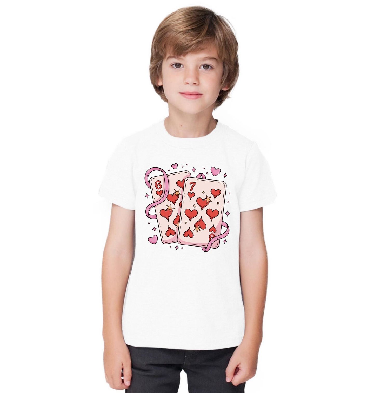 Dětské tričko Srdcové Karty 67 Six Seven. Hravý a originální motiv inspirovaný světem karet, humoru a internetových trendů. Na motivu je srdcová karta 6 a 7 six seven, která se stala oblíbeným meme mezi fanoušky karetních her i popkultury. Skvěle se hodí jako dárek pro hráče a milovníky meme kultury.