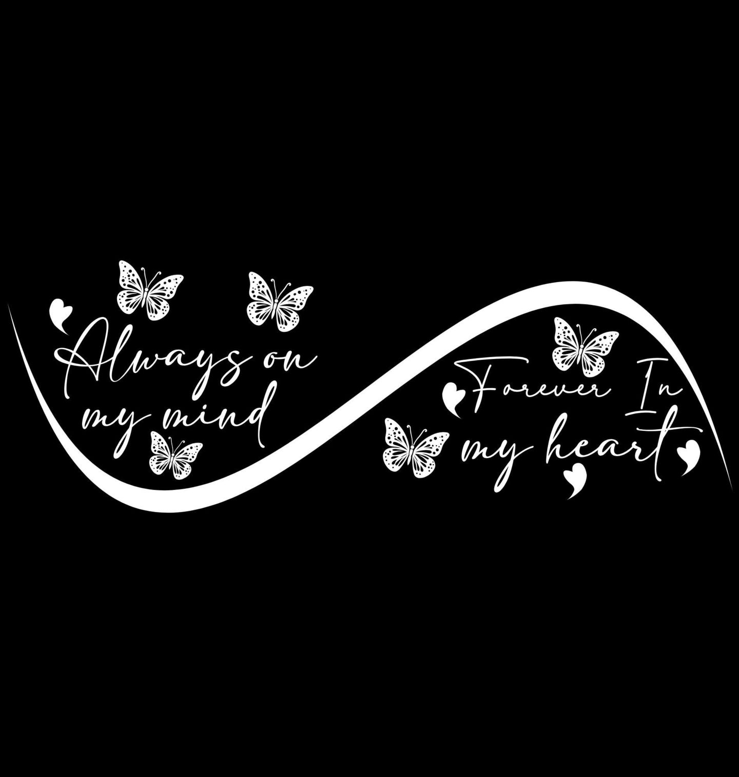 Pánské tričko Stále v mé mysli, navždy v mém srdci. Elegantní motiv s jemnými siluetami motýlů a citátem "Always on my mind, Forever in my heart" je ideálním způsobem, jak vyjádřit vzpomínku na milovanou osobu. Symbol motýla zde představuje duši, svobodu a věčnou lásku.