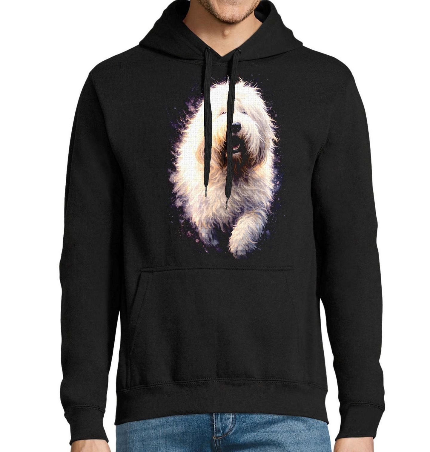 Pánská mikina Staroanglický ovčák. Tento jedinečný motiv zachycuje ikonické plemeno Starý anglický ovčák (Bobtail), které je známé svou bohatou, huňatou srstí a přátelskou povahou. Každý pejskař ocení detailní zpracování srsti i jemný výraz, který vystihuje klidnou, hravou a oddanou povahu tohoto plemene. Starý anglický ovčák je inteligentní a společenský pes, který byl původně využíván jako pastevecký pomocník, ale dnes je především milovaným rodinným společníkem.