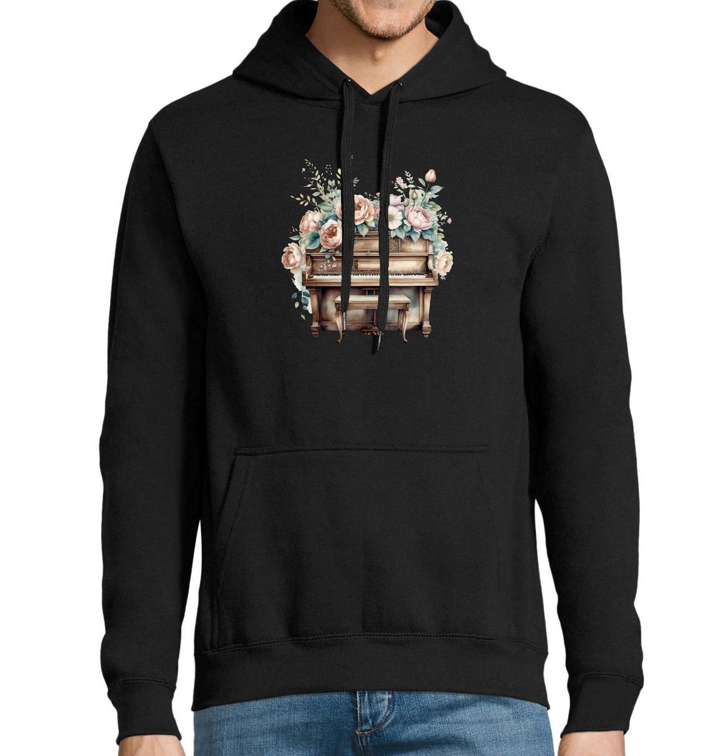 Pánská mikina Starožitné Piano v Květinách. Vintage piano v retro stylu je zdobené jemnými růžemi, pivoněmi a listy, které dodávají celému motivu nostalgický, jemný nádech. Skvělý dárek pro milovníky hudby, klavíristy i všechny, kdo milují květiny a vintage atmosféru. Perfektní motiv pro všechny, kdo milují piano a květiny.