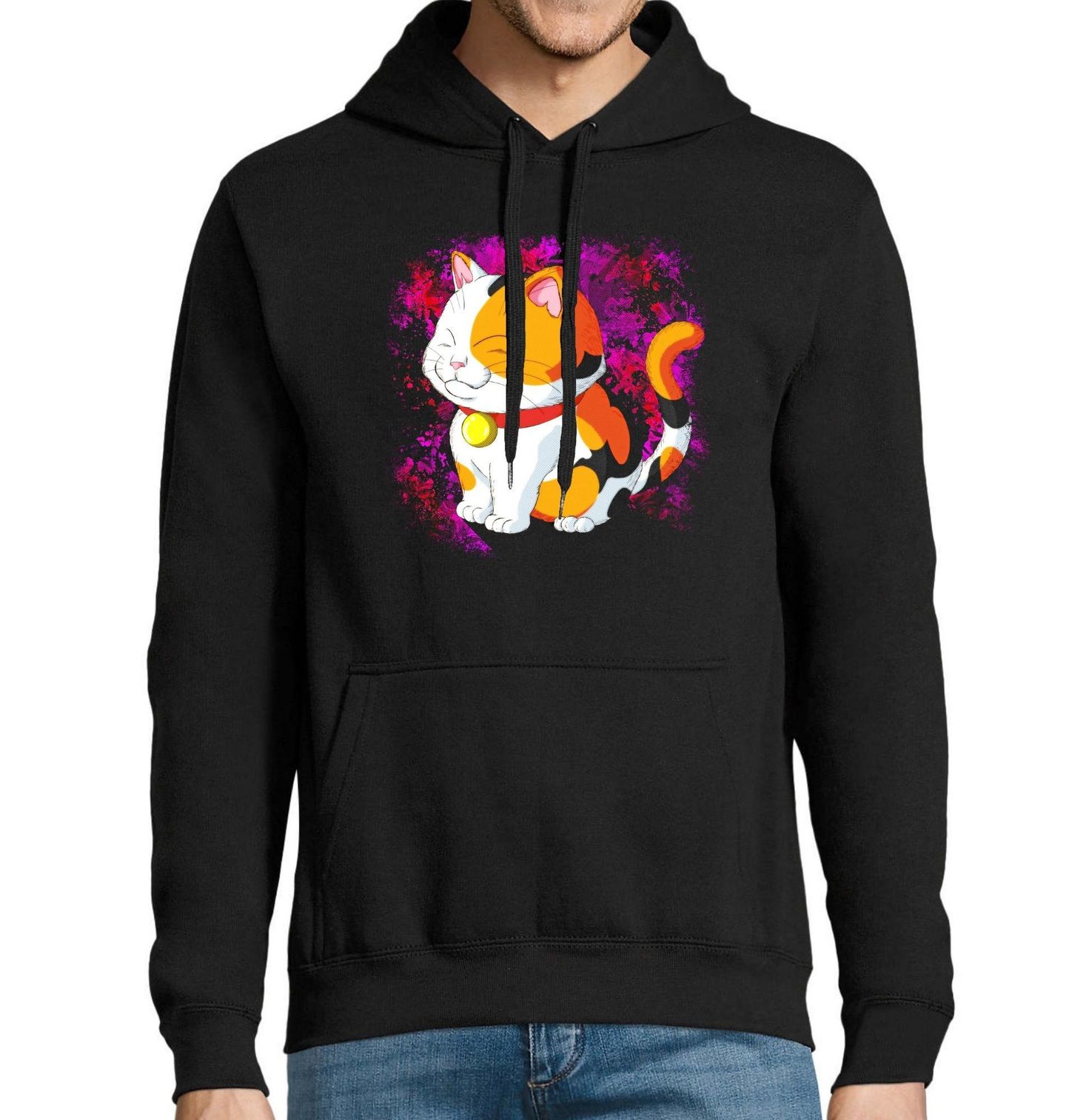 Pánská mikina Šťastná Japonská Kočka. Roztomilý motiv šťastné kočky ve stylu maneki-neko přináší pozitivní energii a úsměv na tváři. Barevná kočka s líbezným výrazem a zvonkem na krku je symbolem štěstí, hojnosti a dobré nálady. Ideální design pro milovníky koček, japonské kultury a hravé estetiky.