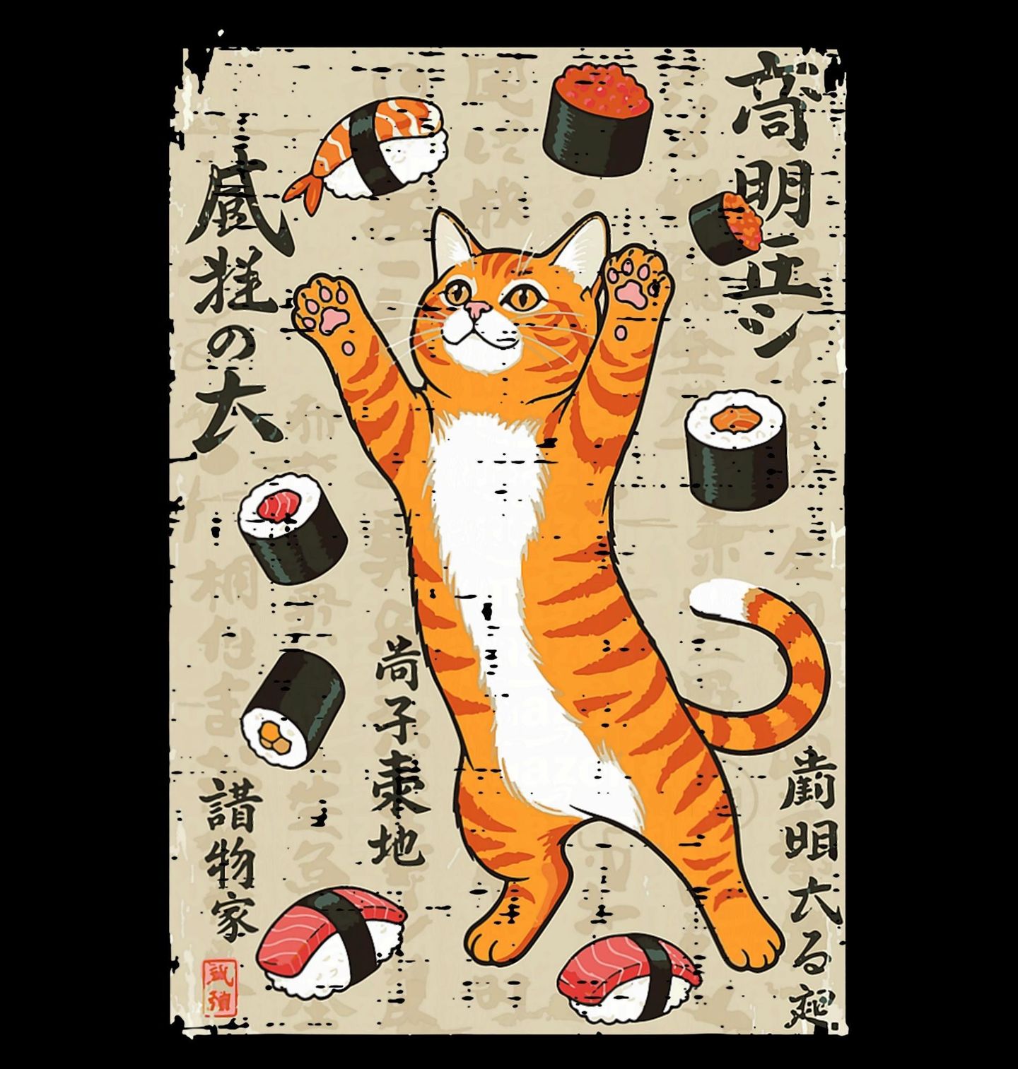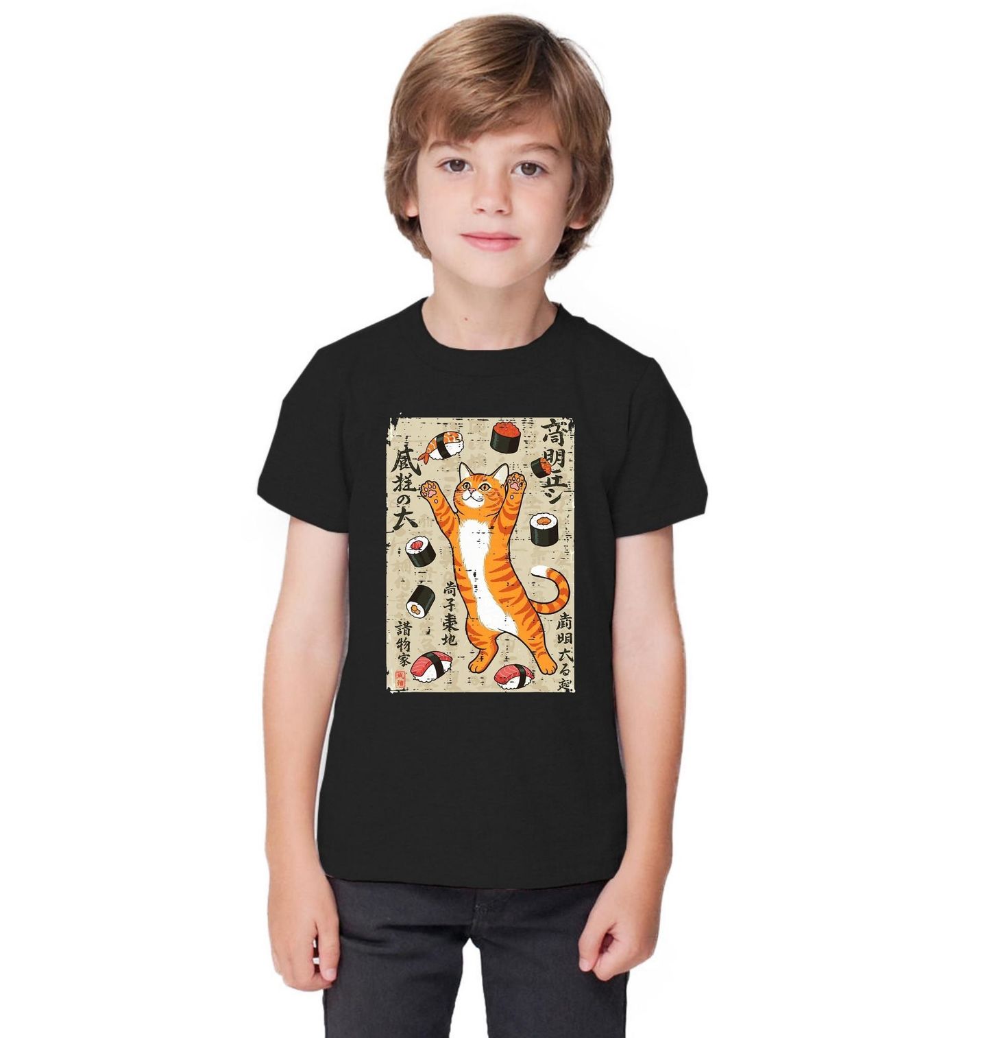 Dětské tričko Šťastná Kočka mezi Sushi Kousky. Tento hravý motiv zachycuje, jak si kočka užívá svět sushi jako v Japonsku. Veselá zrzavá kočka stojí s tlapkami nahoře, jako by chytala kolem sebe poletující sushi kousky – nigiri i maki. Tento motiv je ideální pro všechny, kdo milují kočky, sushi a Japonsko.