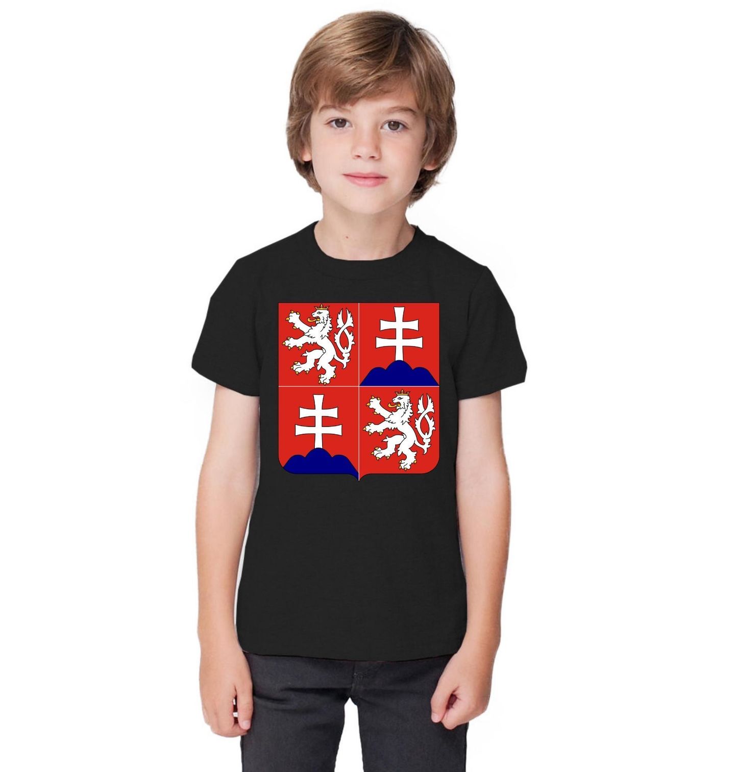 Dětské tričko Státní znak ČSFR. Tento motiv zobrazuje historický státní znak České a Slovenské Federativní Republiky (ČSFR), který navazuje na tradici společného státu a symboliku zemí dnešního Česka a Slovenska. Dominantním prvkem je český lev, tradiční heraldický znak představující sílu, odvahu a státnost.