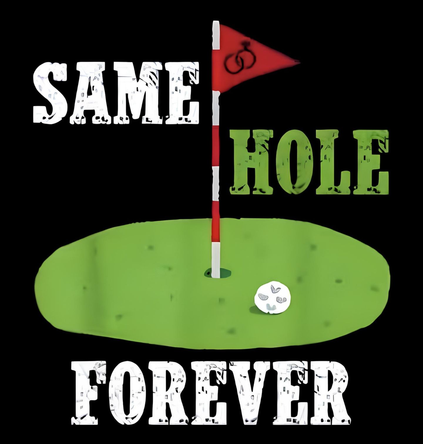 Dámské tričko Stejná Jamka Navždy Same Hole Forever. Motiv s golfovou jamkou a vlajkou doplněný textem „Same Hole Forever“ (Stejná jamka navždy). Design nese jemný humorný a dvojznačný podtón, který ocení především milovníci golfu a manželství. Může symbolizovat věrnost sportu, oblíbenému hřišti nebo i životnímu stylu spojenému s golfem.