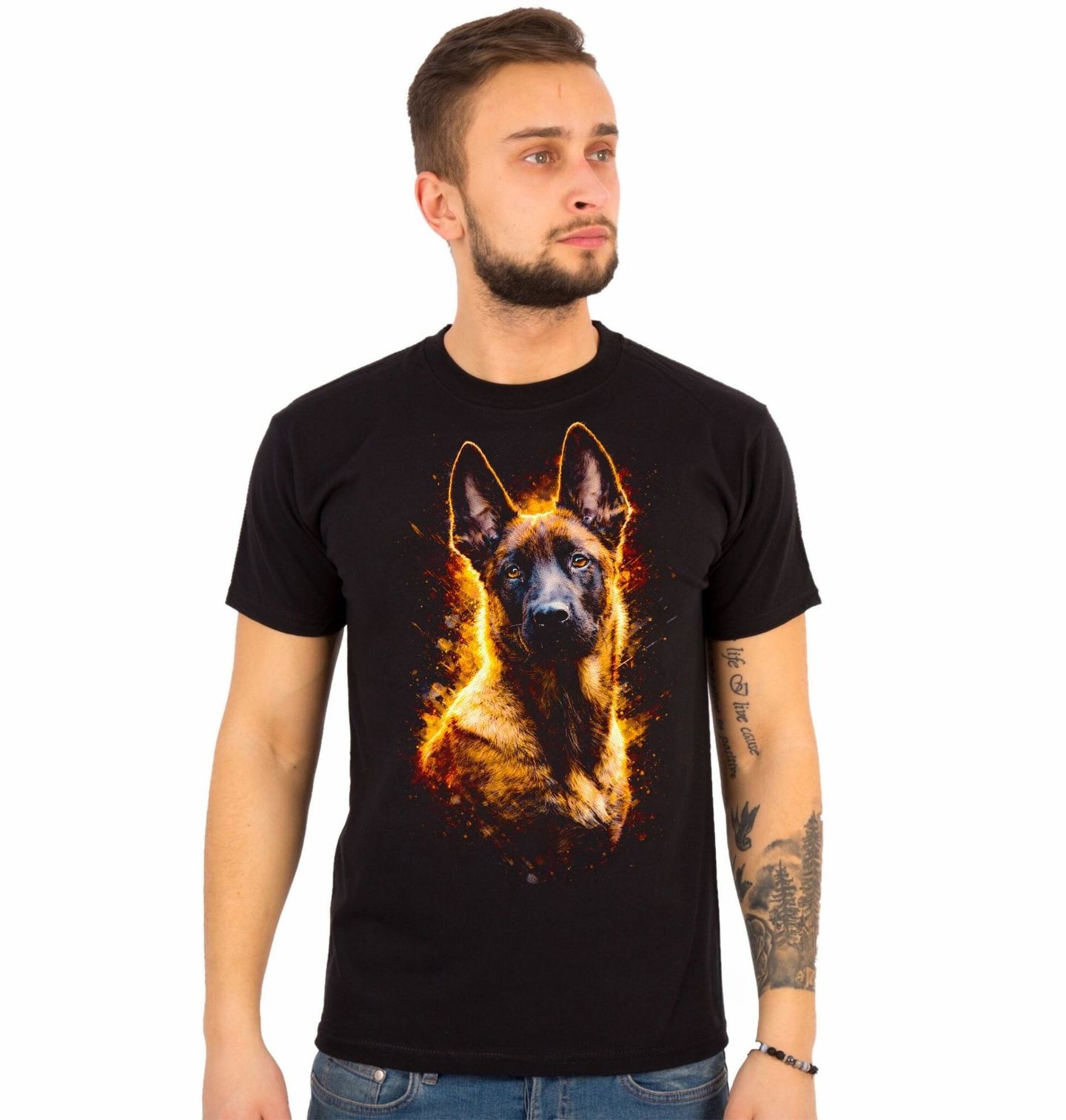 Pánské tričko Štěně Belgického ovčáka Malinois. Belgický ovčák Malinois je mimořádně inteligentní, pracovitý a oddaný pes, často využívaný u policie, armády nebo při sportovní kynologii. Tento moderní design s ohnivými efekty perfektně vystihuje jeho temperament a nezkrotnou energii. Skvěle se hodí na oblečení i doplňky pro aktivní lidi a milovníky pracovních plemen.