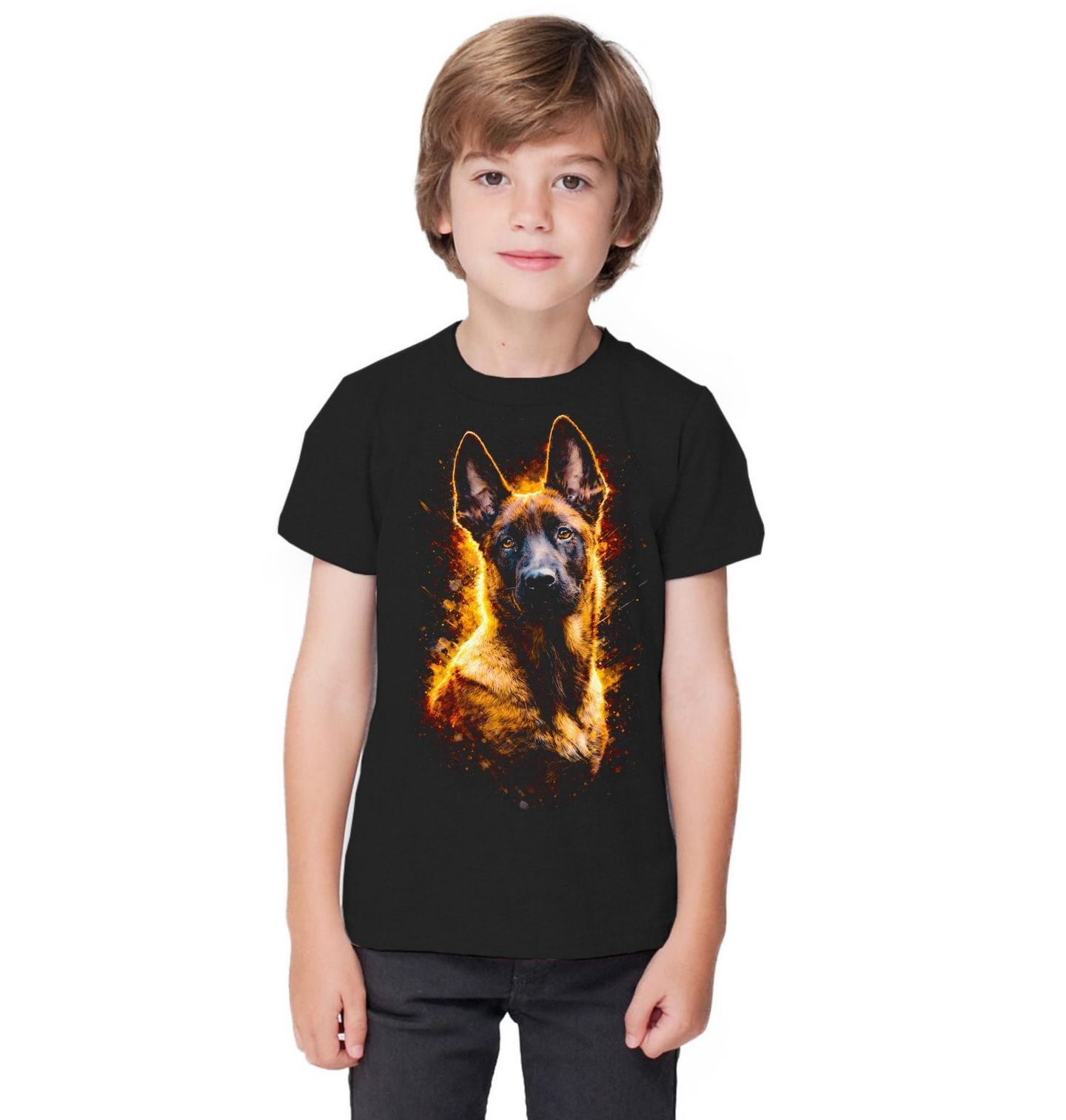Dětské tričko Štěně Belgického ovčáka Malinois. Belgický ovčák Malinois je mimořádně inteligentní, pracovitý a oddaný pes, často využívaný u policie, armády nebo při sportovní kynologii. Tento moderní design s ohnivými efekty perfektně vystihuje jeho temperament a nezkrotnou energii. Skvěle se hodí na oblečení i doplňky pro aktivní lidi a milovníky pracovních plemen.