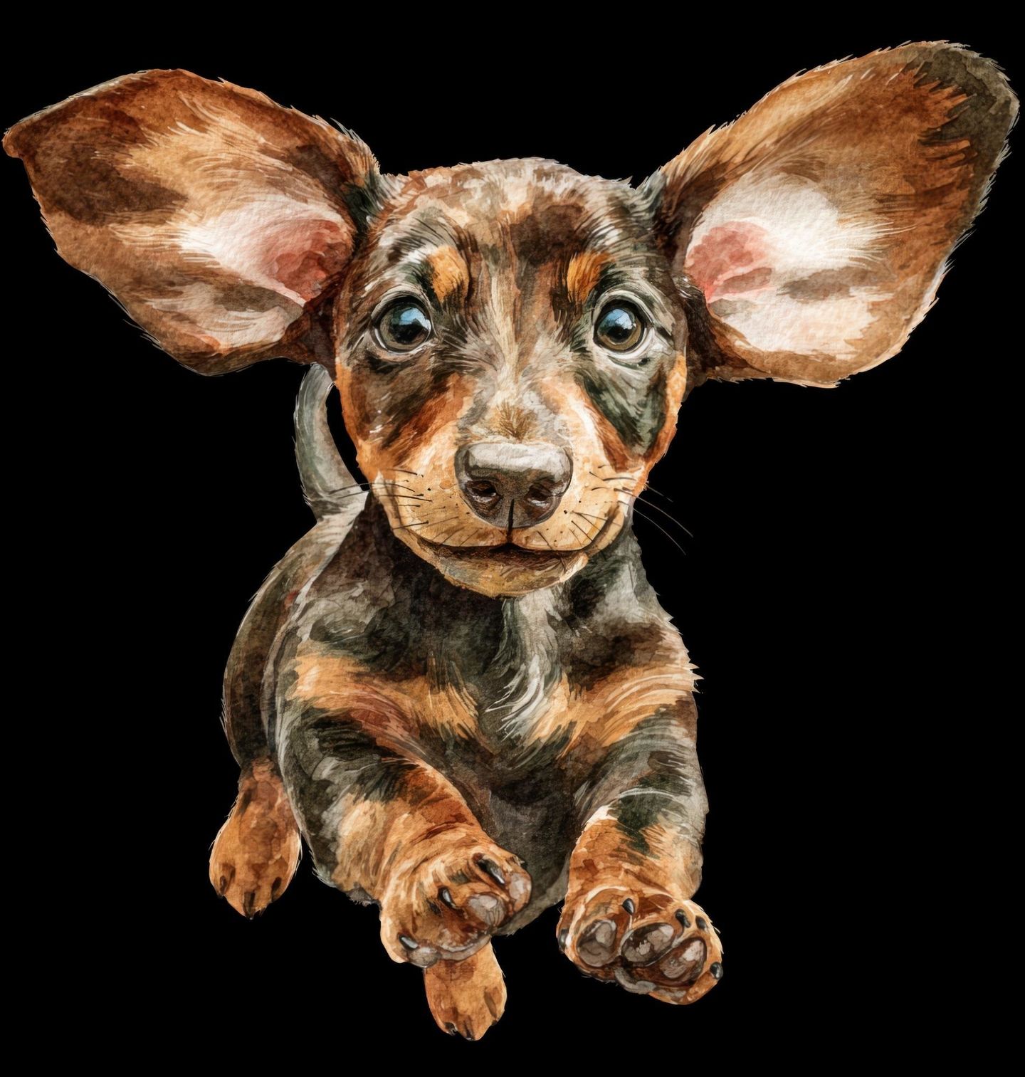 Pánské tričko Štěně Jezevčíka. Jezevčík jako hravé štěně je motiv, který si zamiluje každý pejskař. Tento roztomilý pes s typickýma velkýma ušima a bystrým pohledem působí mile, vesele a okamžitě vykouzlí úsměv na tváři. Jezevčík je pes známý svou odvahou, oddaností a živým temperamentem, a právě tyto vlastnosti jsou v motivu krásně zachyceny.