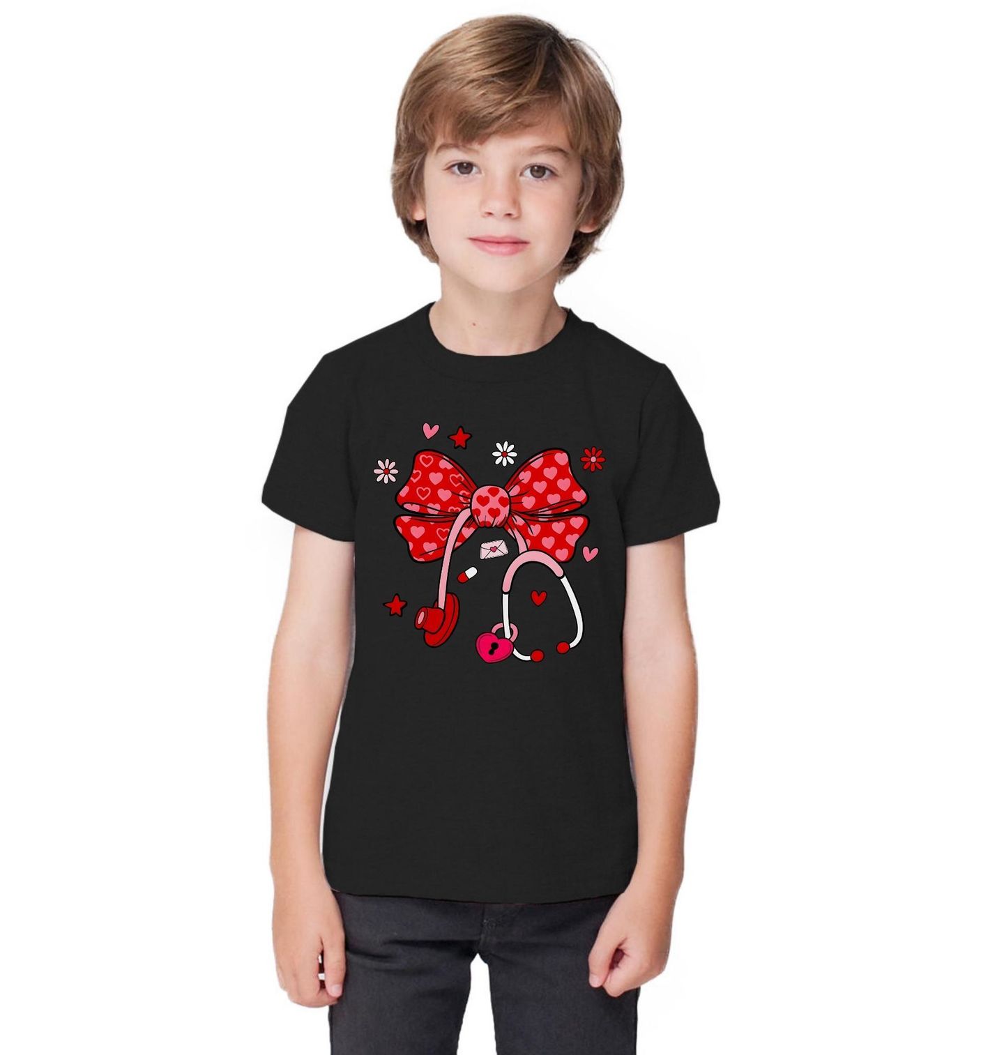 Dětské tričko Stetoskop plný Lásky. Tento hravý a láskyplný motiv spojuje srdce, stetoskop a symboly péče, které neodmyslitelně patří ke světu, kde každý lékař dává svou práci srdcem. Ilustrace vychází z prostředí zdravotnictví a zobrazuje stetoskop stylizovaný do tvaru srdce, doplněný o jemné detaily vyjadřující empatii, péči a lidskost.