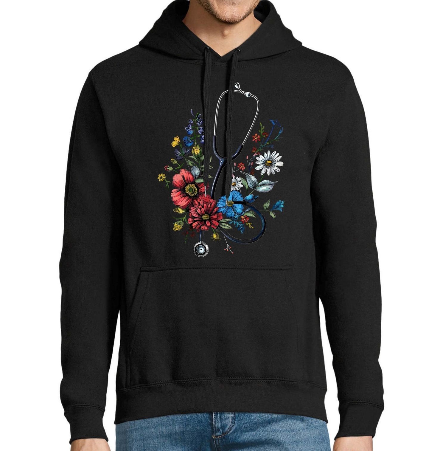 Pánská mikina Stetoskop v Květech Života. Jedinečný motiv, který propojuje svět přírody a péče o zdraví. Dominantní stetoskop je obklopen pestrými květinami, které symbolizují život, naději a lidskost. Tento design krásně vystihuje poslání zdravotnictví – nejen léčit, ale také přinášet klid, empatii a podporu. Květiny dodávají motivu jemnost a harmonii, zatímco stetoskop představuje odbornost a každodenní práci všech, kteří působí ve zdravotnictví.