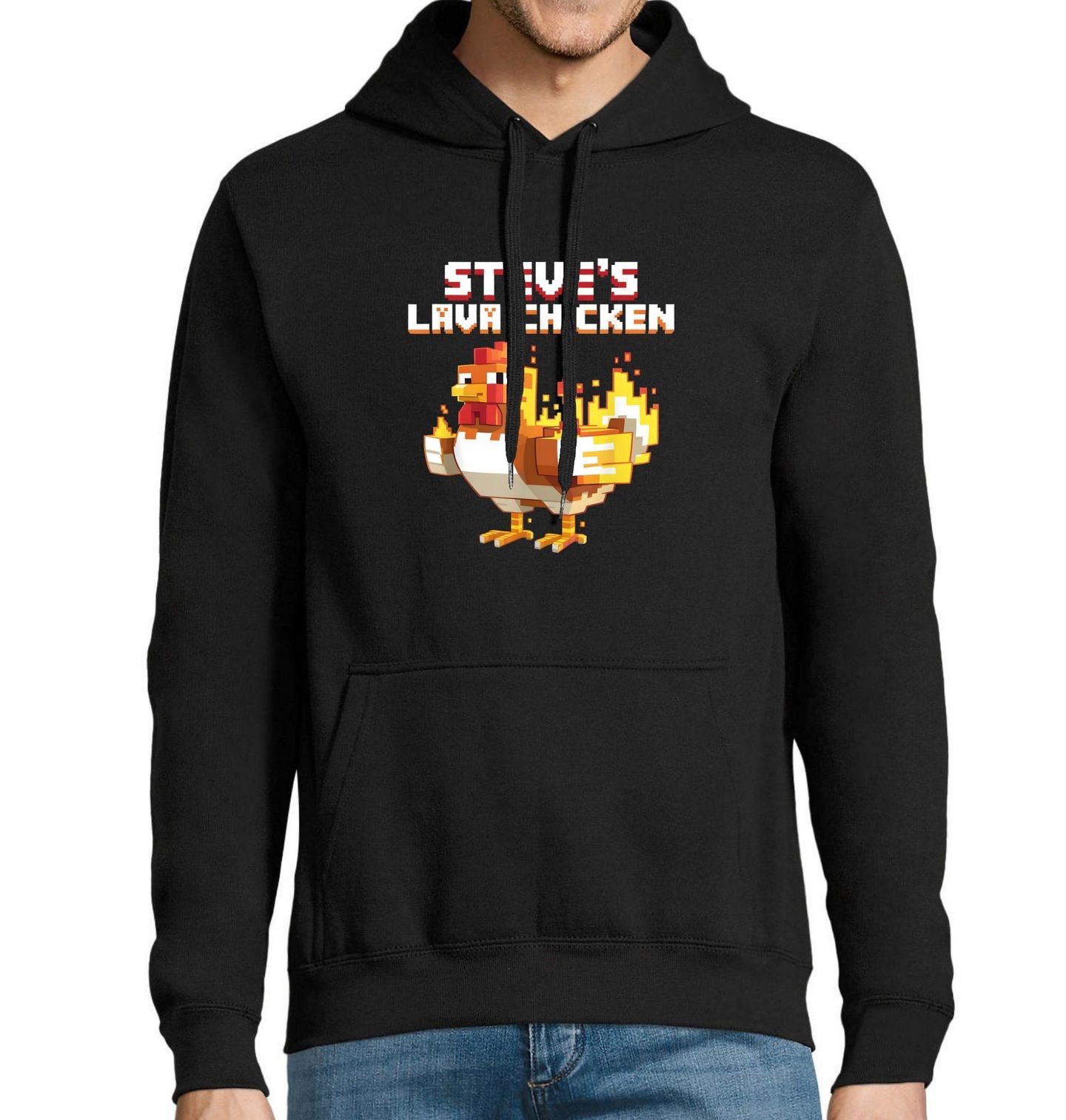 Pánská mikina Steveovo Lávové Kuře Minecraft. Steve's Lava Chicken. Tohle kuře z Minecraftu nebylo na grilu – to si jen Steve zapomněl zavřít lávovou past. Výsledkem je legendární Lava Chicken, hrdina (nebo oběť?) každé pixelové pohromy. Tričko pro všechny hráče, memery a gamery Minecraftu.