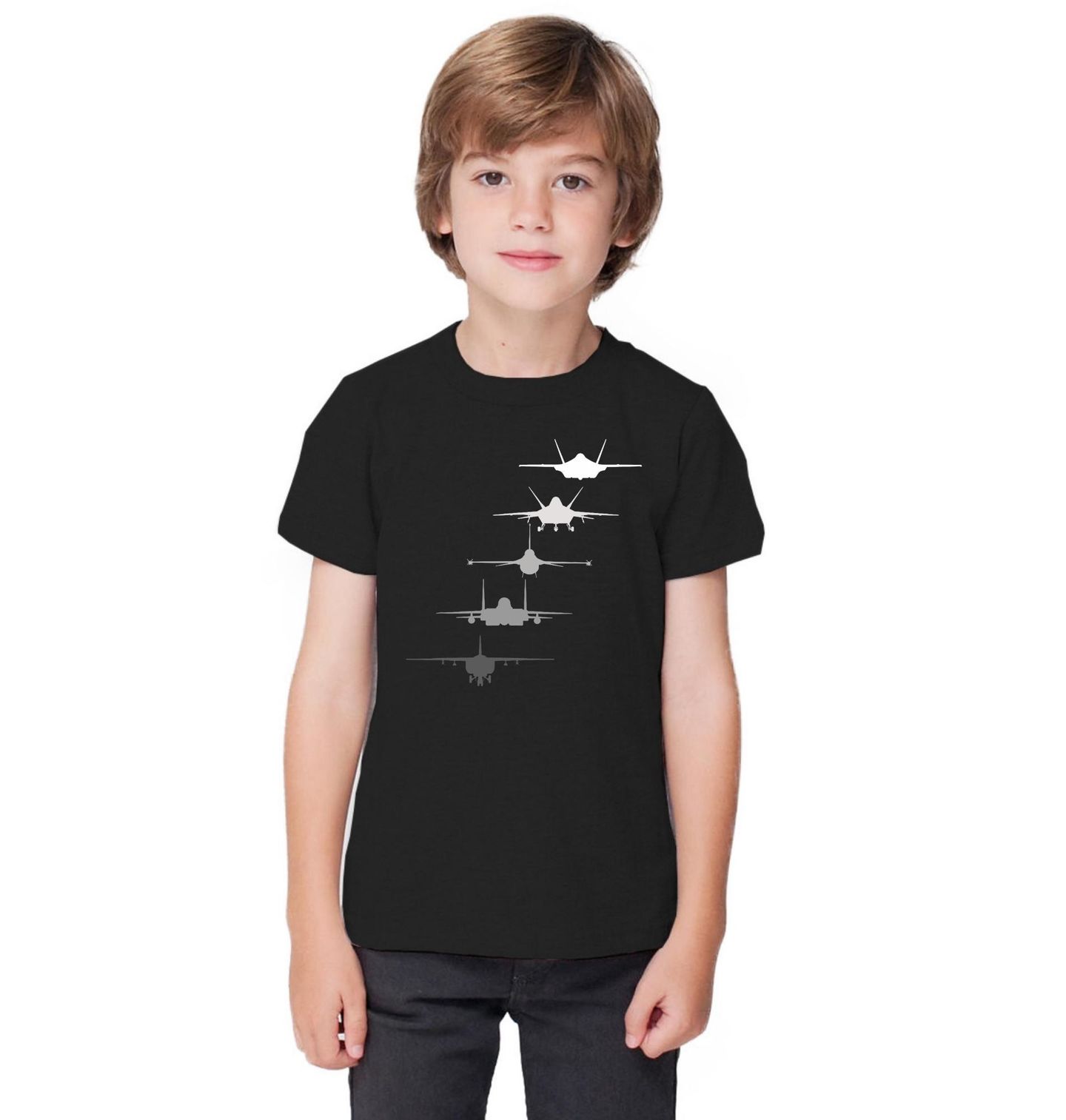 Dětské tričko Stíhací Letadla v Akci. Minimalistický design zachycující siluety moderních strojů, kde letadlo dominuje svou rychlostí a silou. Motiv vyjadřuje dynamiku a technologickou preciznost letectví bez textu, čistě vizuálním dojmem. Pro všechny milovníky letadel či stíhaček.