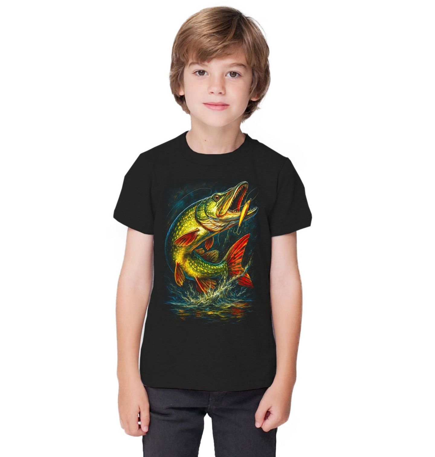 Dětské tričko Štika obecná na Háčku. Výrazný a napínavý motiv zachycuje štiku obecnou (Esox lucius) v kritickém okamžiku, kdy se dravec zakousne přímo do třpytky s háčkem. Otevřená tlama, lesklá nástraha a rozvířená voda vystihují přesně ten zlomový moment, na který každý rybář čeká. Právě takové sekundy dělají rybaření vášní plnou adrenalinu.