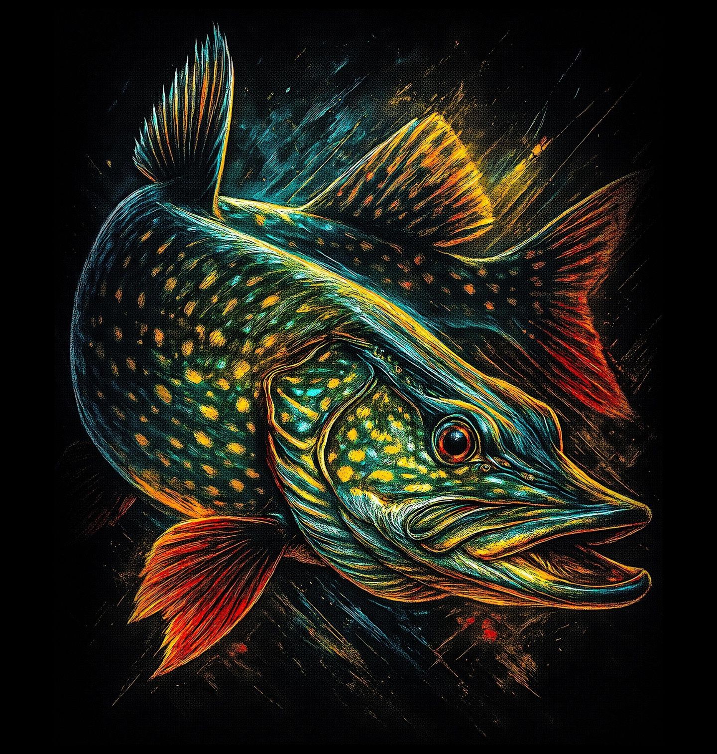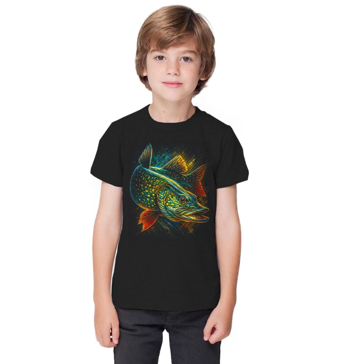 Dětské tričko Štika obecná Northern pike. Tento dynamický motiv zachycuje štiku obecnou (Esox lucius) v typickém útočném postoji. Protáhlé tělo, ostrá tlama a charakteristické světlé skvrny na tmavém podkladu jasně prozrazují jednoho z nejrespektovanějších dravců našich vod. Štika je snem i výzvou každého, kdo bere rybaření vážně. Pro zkušeného rybář představuje symbol trpělivosti, strategie a respektu k přírodě.