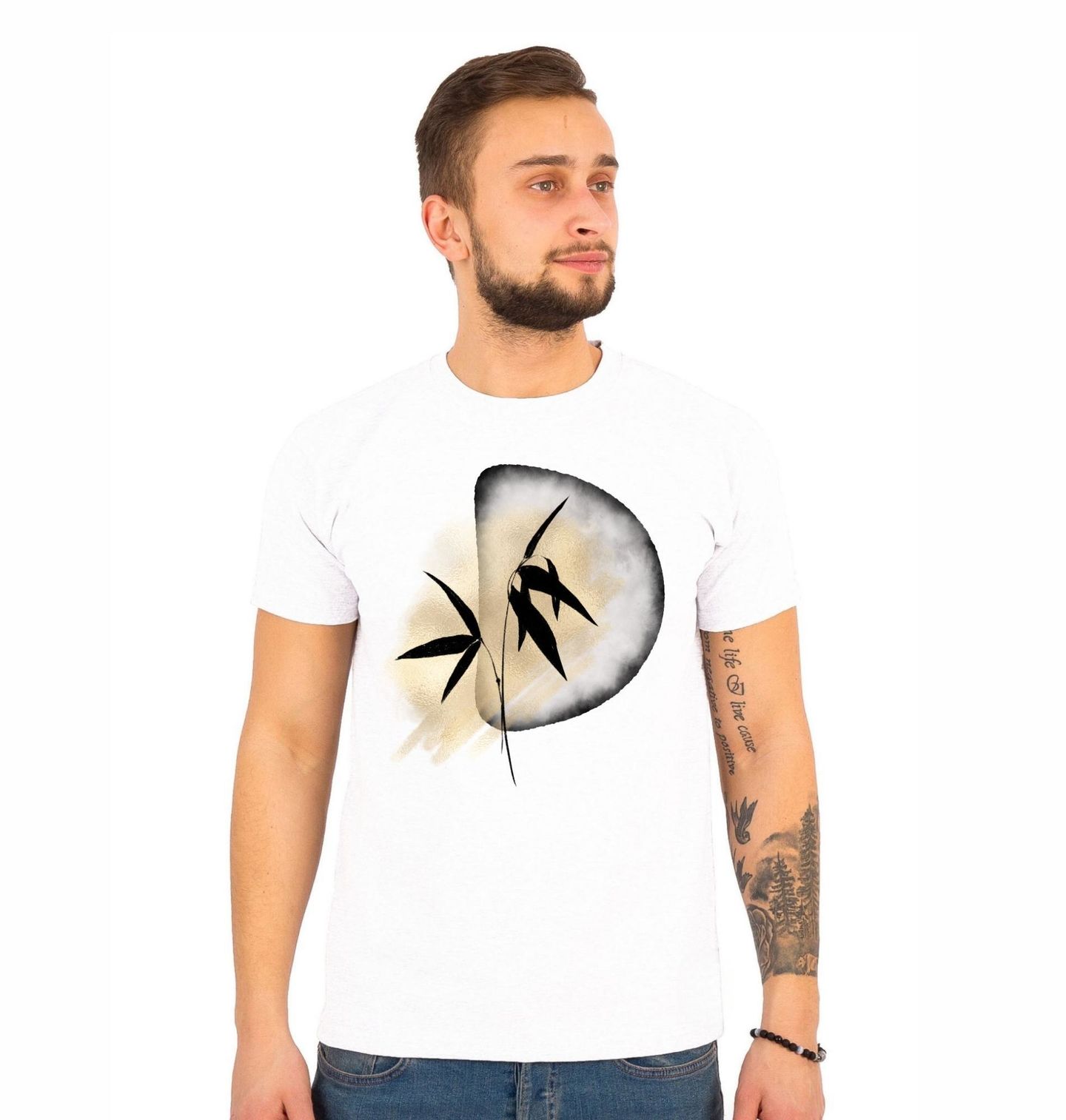 Pánské tričko Stín Bambusu Ink wash painting. Elegantní motiv bambusu inspirovaný tradiční japonskou a čínskou technikou inkoustové malby (ink wash painting) přináší do vašeho šatníku klid, rovnováhu a jemné spojení s přírodou. Tento design čerpá z umění Japonska a Číny, konkrétně z tradičního stylu sumi-e, kde se pomocí jednoduchých tahů vytváří hluboký umělecký dojem.