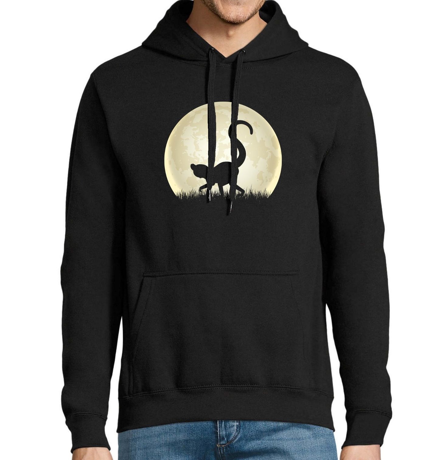 Pánská mikina Stín Lemura při Úplňku. Silueta lemura v nočním šeru pod září úplňku – tento motiv zachycuje magickou atmosféru, kdy se příroda probouzí k životu za svitu měsíce. Stylové tričko pro všechny milovníky zvířat, tajuplné přírody a nočních výletů.