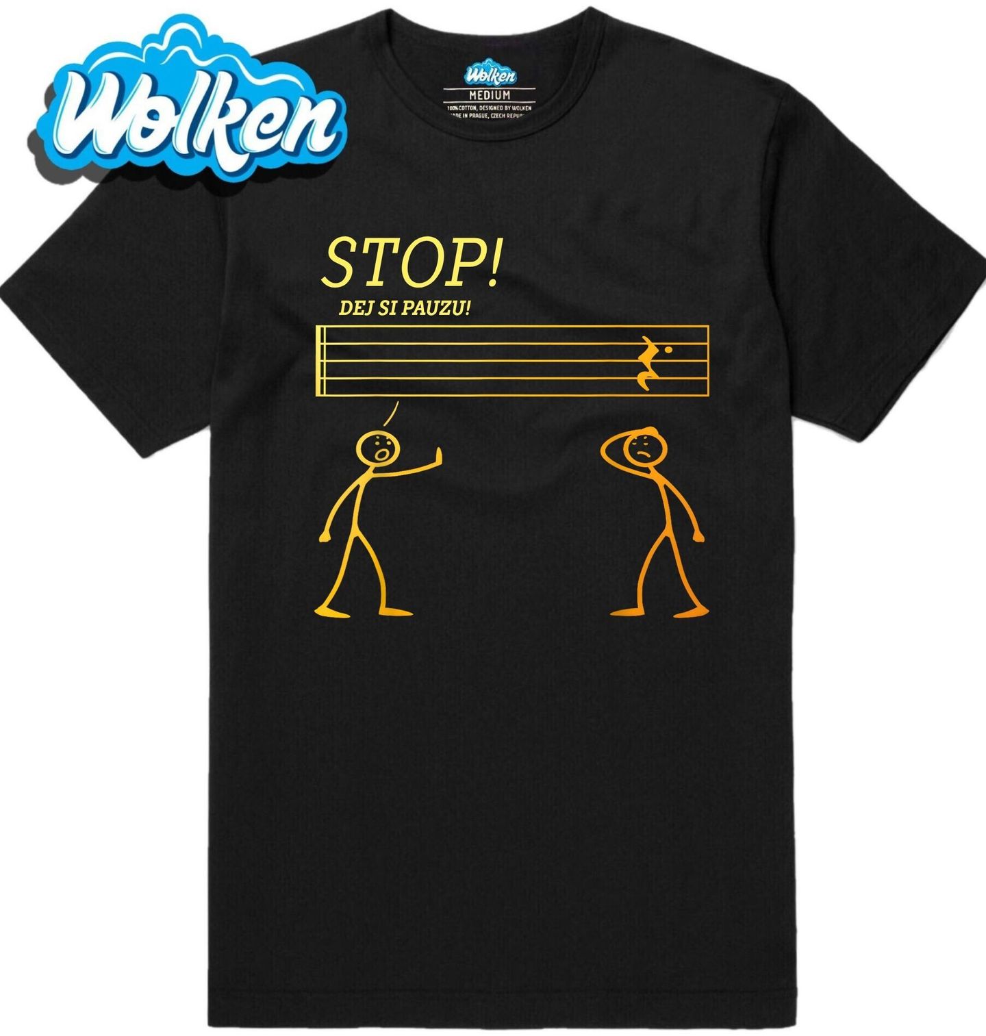 Pánské tričko Stop! Dej si pauzu Hudebník Stickman. Originální motiv s postavičkami stickman, které přinášejí vtipný odkaz na hudbu. Na obrázku je hudební stupnice, noty a pauza na celou dobu (někdy se jí také říká celotaktová pauza). Skvělý dárek pro hudebníky, učitele hudby nebo milovníky humoru spojeného s hudební teorií.