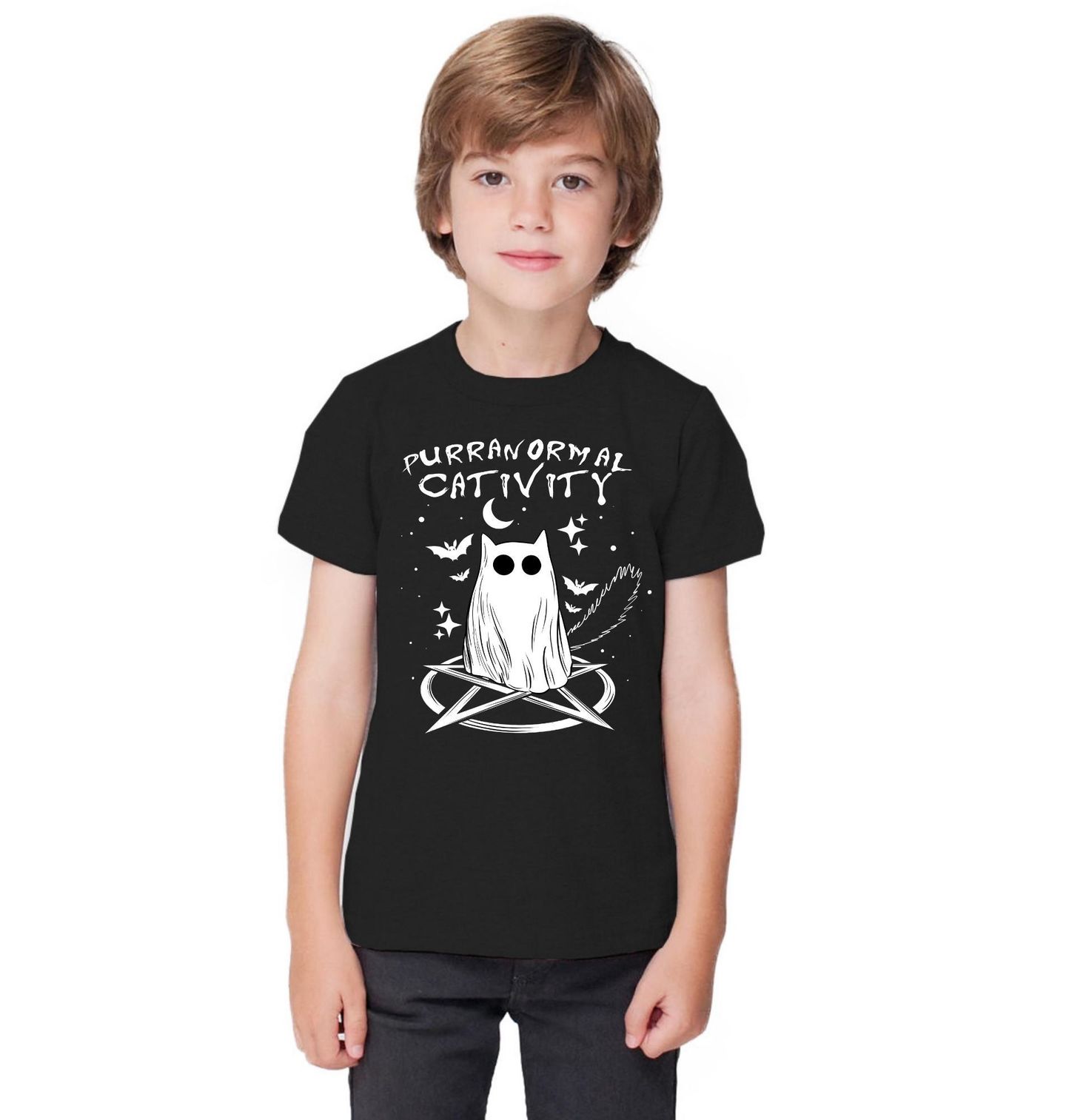Dětské tričko Strašidelná Kočičí Aktivita. Stylizovaný motiv zachycuje tajemnou kočku jako ducha uprostřed symbolického kruhu s netopýry a hvězdami. Text „Purranormal Cativity“ je slovní hříčka a znamená „Paranormální kočičí aktivita“. Ideální design pro fanoušky hororu, mystiky a koček.
