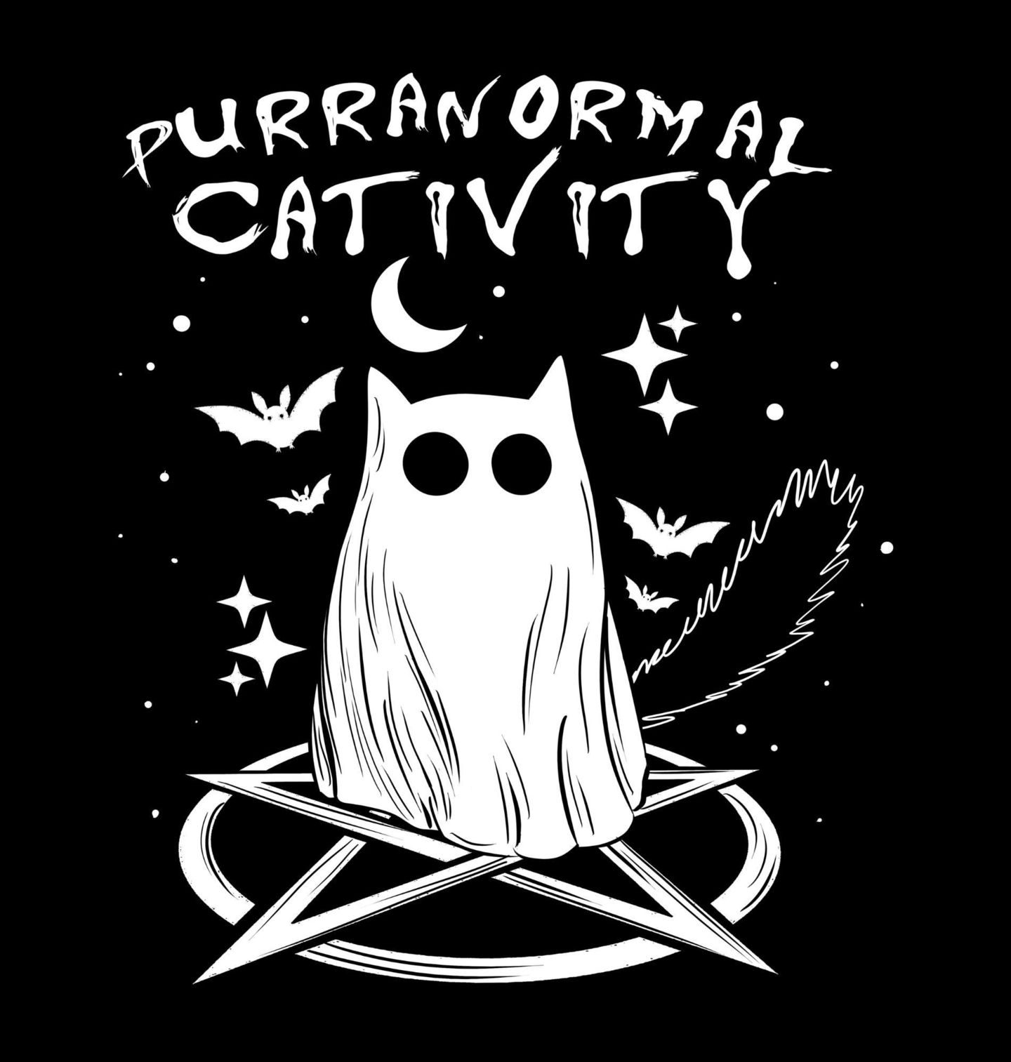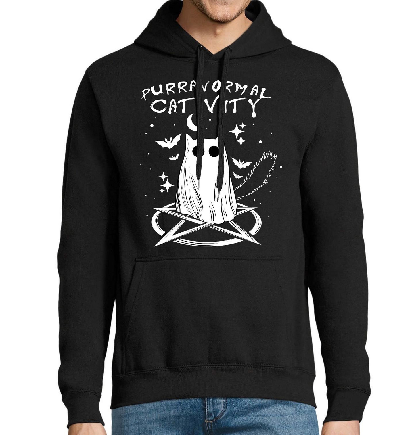 Pánská mikina Strašidelná Kočičí Aktivita. Stylizovaný motiv zachycuje tajemnou kočku jako ducha uprostřed symbolického kruhu s netopýry a hvězdami. Text „Purranormal Cativity“ je slovní hříčka a znamená „Paranormální kočičí aktivita“. Ideální design pro fanoušky hororu, mystiky a koček.