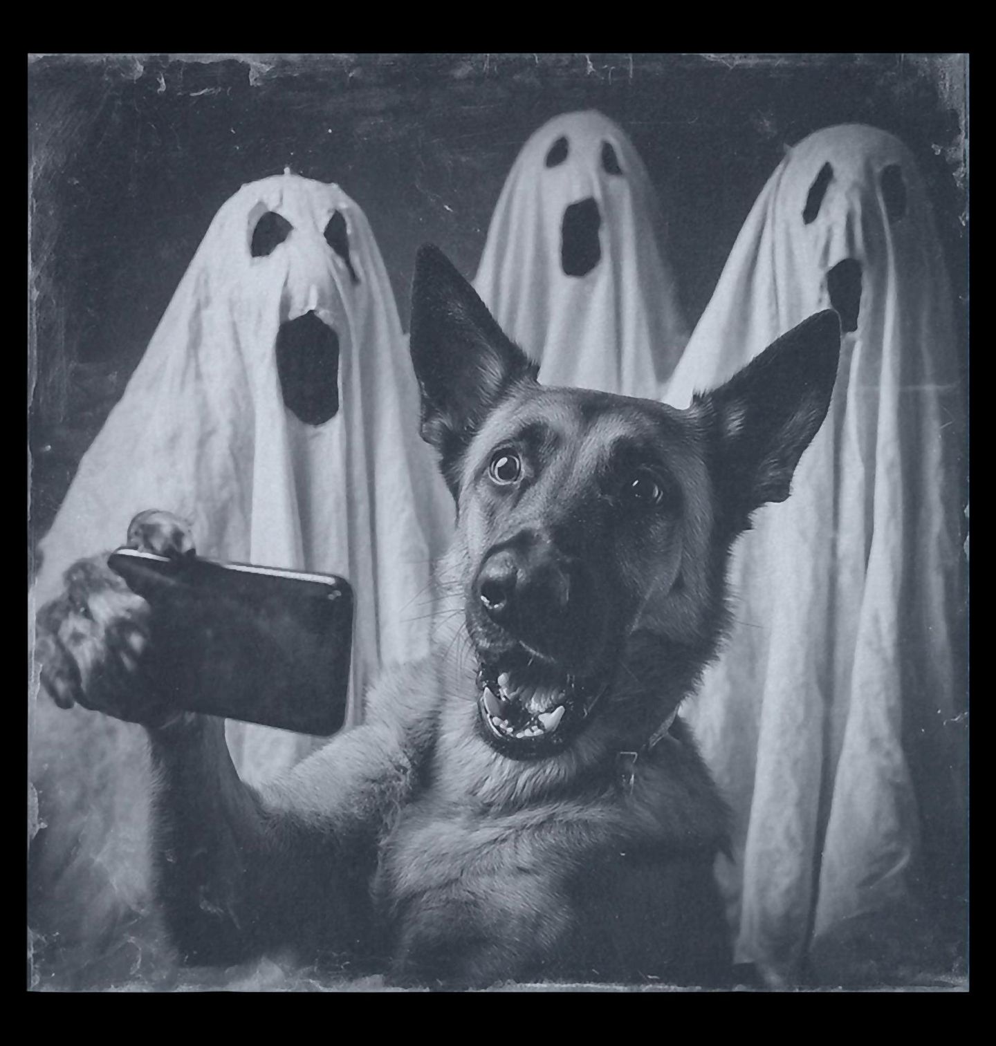 Dětské tričko Strašidelné Selfie Německý ovčák a Duchové. Originální a zábavný motiv, na kterém německý ovčák pořizuje selfie obklopený partou duchů. Černobílý retro styl dodává designu jedinečnou atmosféru a skvěle vystihuje hravou stránku, kterou každý pes umí ukázat. Tento motiv je ideální pro každého, komu je německý ovčák srdcovka a každý pejskař s humorem si tenhle halloween motiv určitě zamiluje.