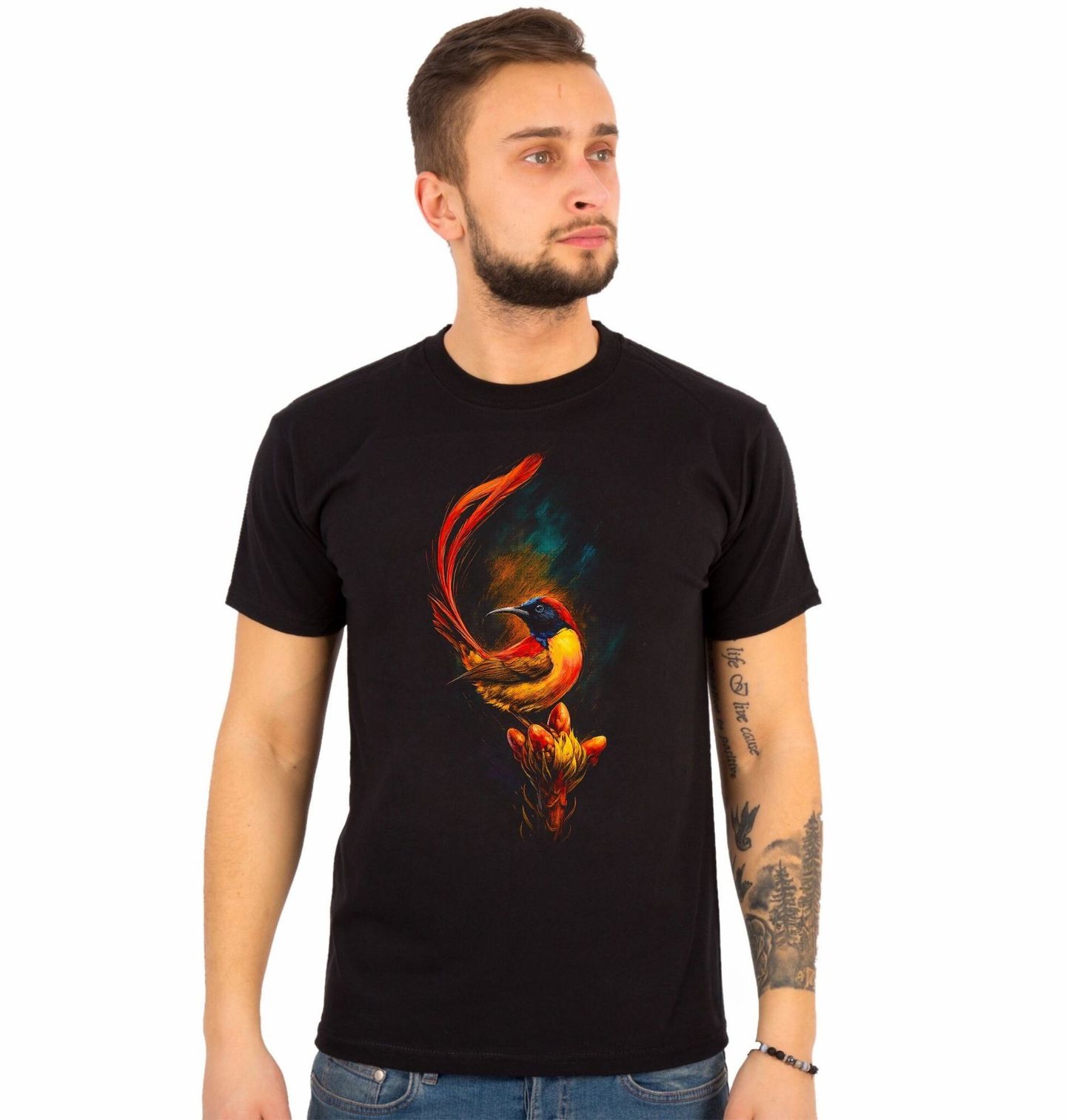 Pánské tričko Strdimil plamenoocasý. Slunečník ohnivoocasý je druh slunečního ptáka z čeledi Nectariniidae. Vyskytuje se v severních částech indického subkontinentu, především v Himalájích. Tento drobný tropický pták vyniká dlouhým ocasem, výrazným červeným a zlatým zbarvením a elegancí typickou pro nektarožravé druhy.
