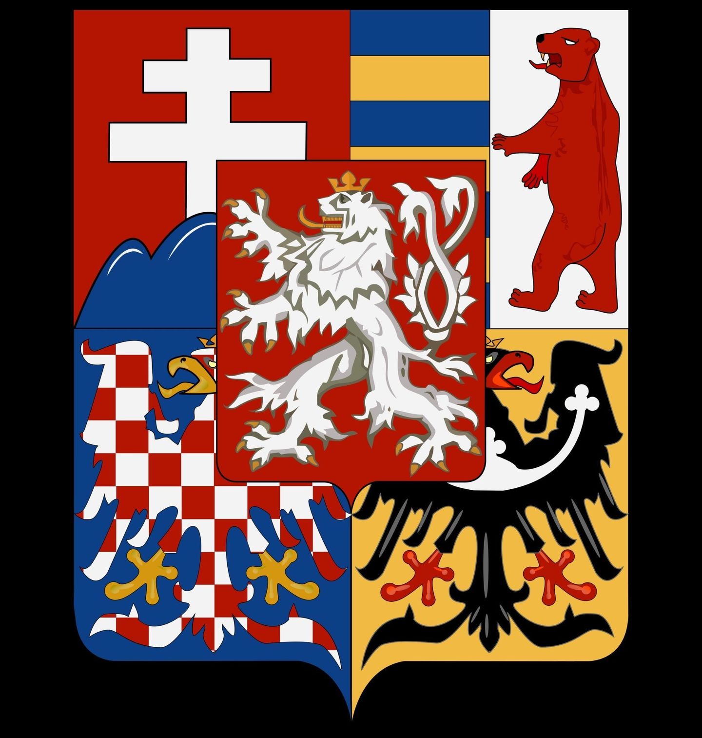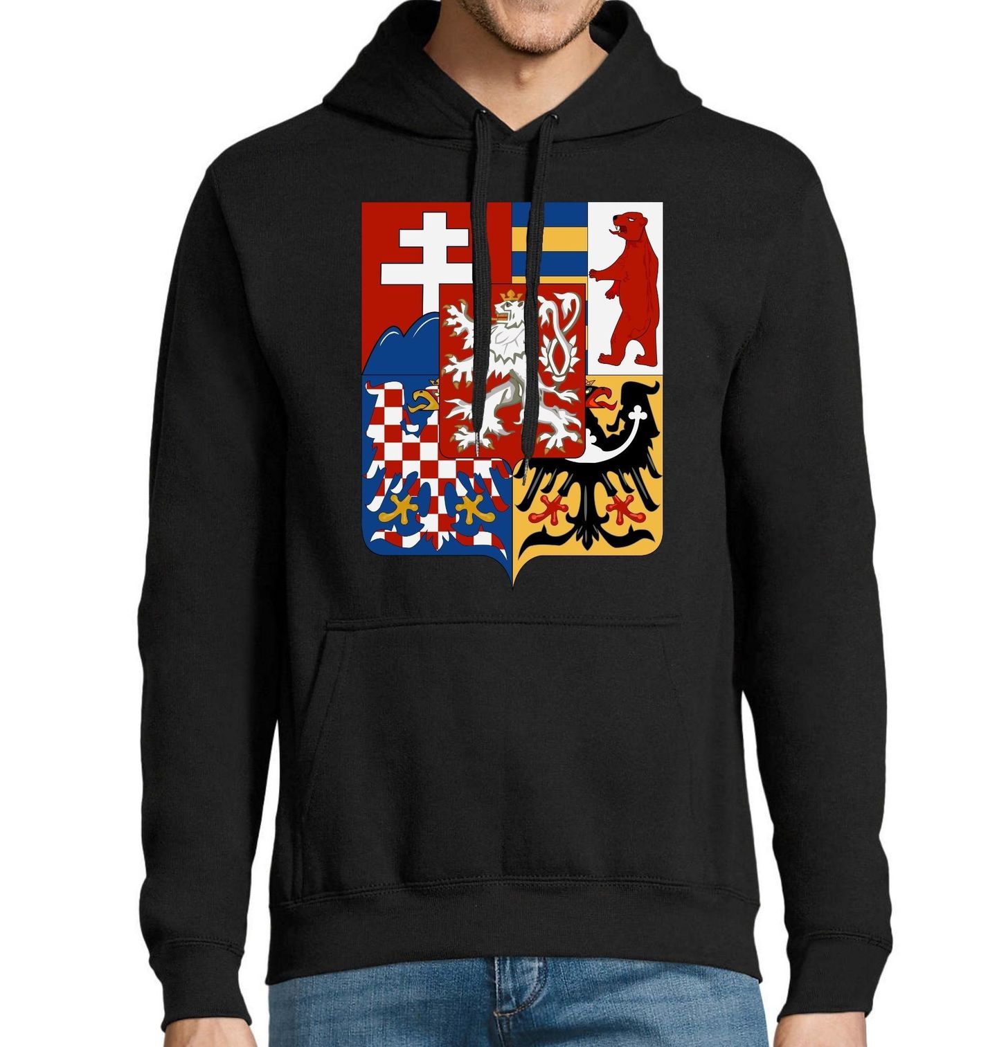 Pánská mikina Střední znak republiky Československé. Tento motiv zobrazuje střední státní znak Československé republiky, významný heraldický symbol, který spojoval tradice zemí tvořících dnešní Česko a širší historické území střední Evropy. V jeho středu stojí český lev, tradiční znak Čech a symbol státnosti, síly a odvahy. Okolo něj jsou heraldické znaky dalších zemí tehdejší republiky – Moravy, Slezska, Slovenska a Podkarpatské Rusi.
