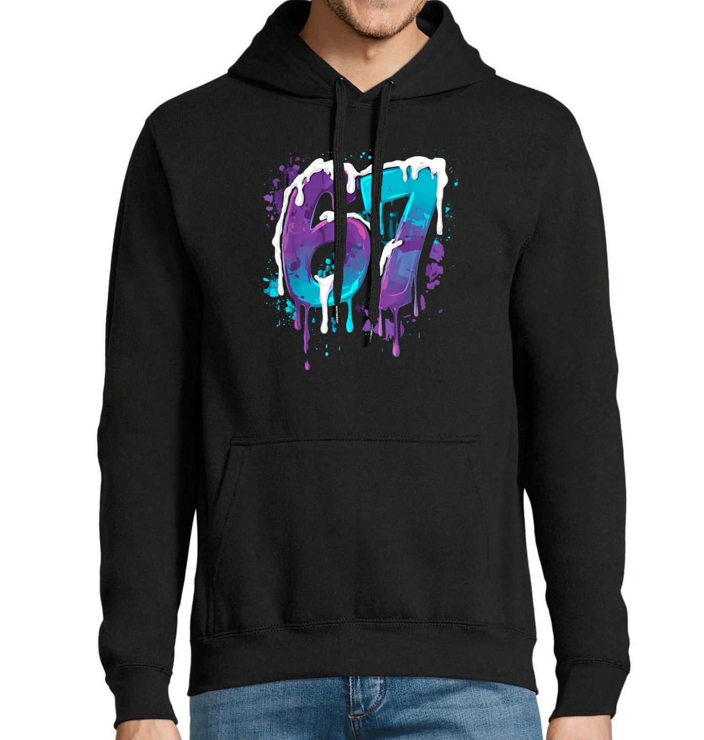 Pánská mikina Street-art Graffiti 67 Six Seven. Stylový a výrazný motiv 67 pro všechny fanoušky kultovního čísla six seven a originální meme grafiky. Číslice 67 jsou zpracované v moderním street-art stylu s kapající barvou a kontrastními barevnými přechody, které okamžitě upoutají pozornost.