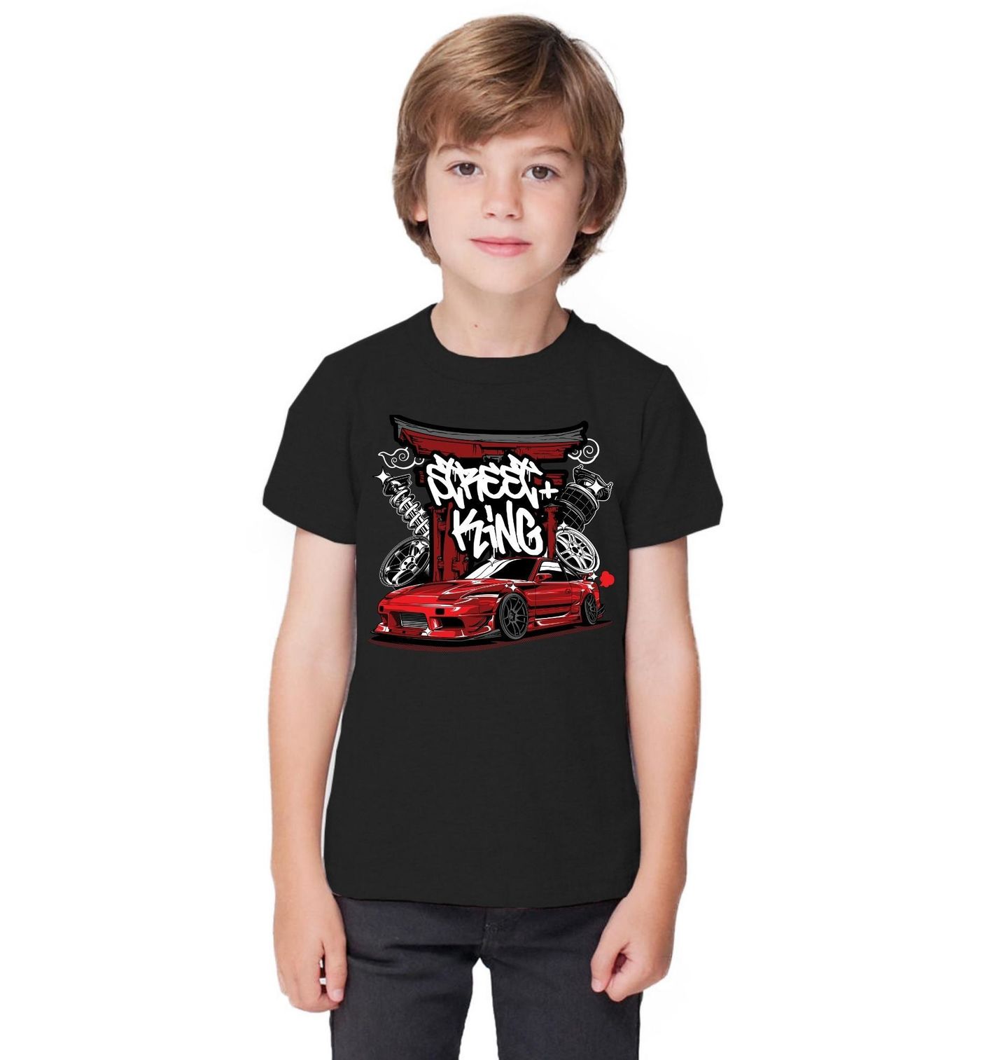 Dětské tričko Street King Drift. Dynamický design zachycuje legendární japonské auto inspirované drift ikonou Nissan 180SX, která se stala symbolem street stylu a tuningové scény. Agresivní bodykit, nízký stance a výrazná červená barva dodávají motivu energii nočních ulic a atmosféru, kterou přináší Japonsko automobilová kultura.