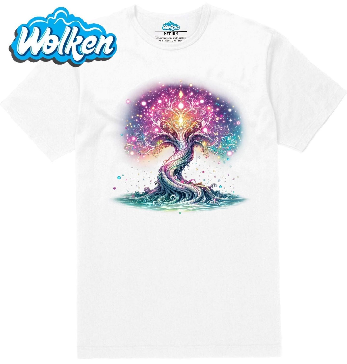 Pánské tričko Strom Splněných Přání. Tento design zachycuje pohádkový strom s barevnou aurou, který symbolizuje propojení přírody, vesmíru a energie. Strom je ztvárněn v magickém víru světla a hvězd, což z něj dělá ideální motiv pro všechny milovníky mystiky, přírody a výjimečných vizuálů.