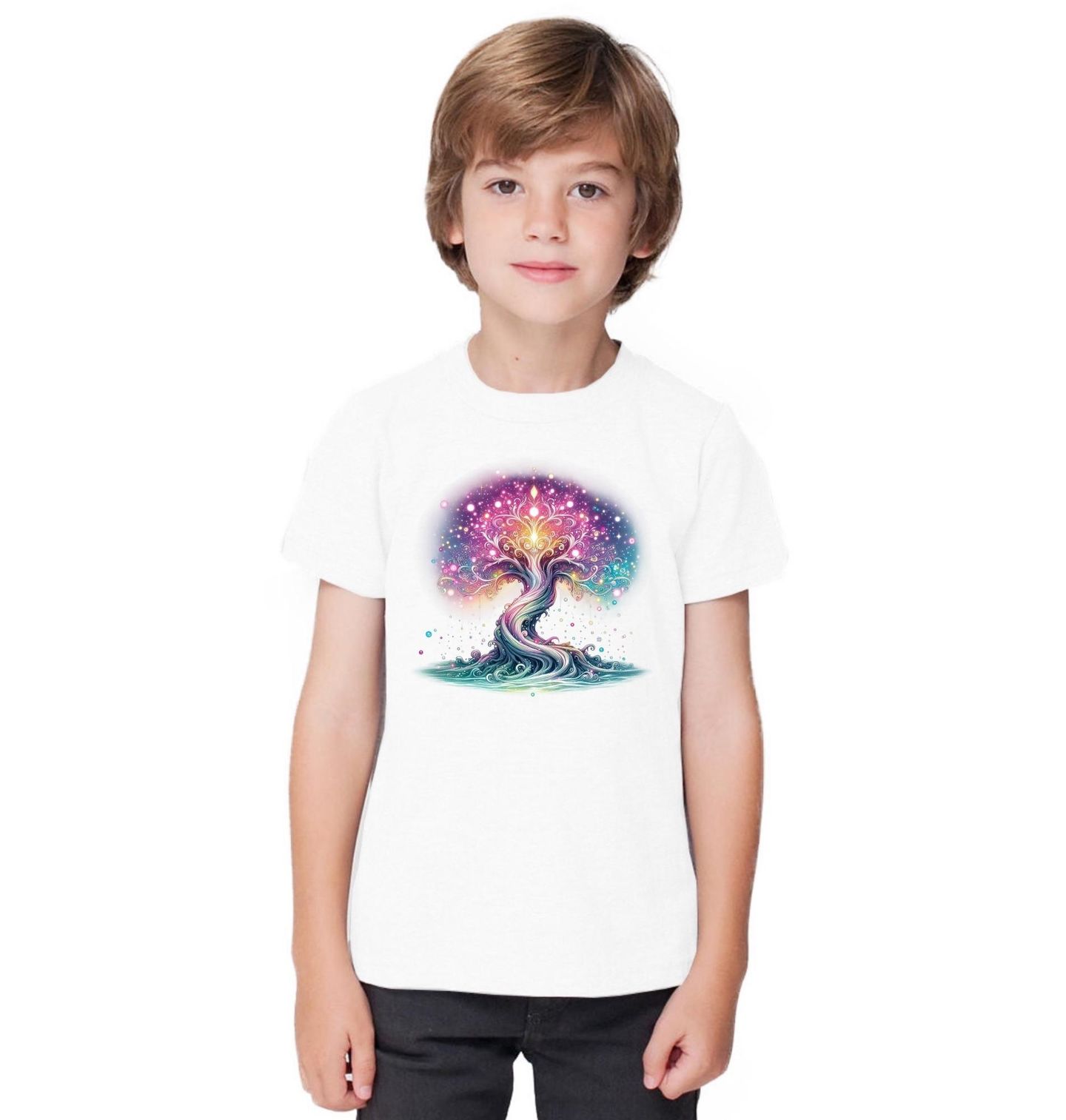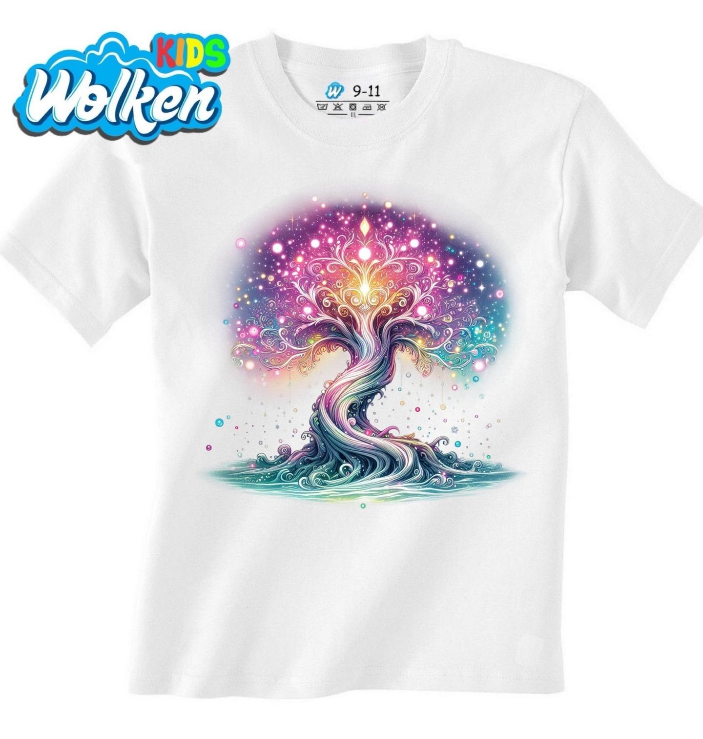 Dětské tričko Strom Splněných Přání. Tento design zachycuje pohádkový strom s barevnou aurou, který symbolizuje propojení přírody, vesmíru a energie. Strom je ztvárněn v magickém víru světla a hvězd, což z něj dělá ideální motiv pro všechny milovníky mystiky, přírody a výjimečných vizuálů.