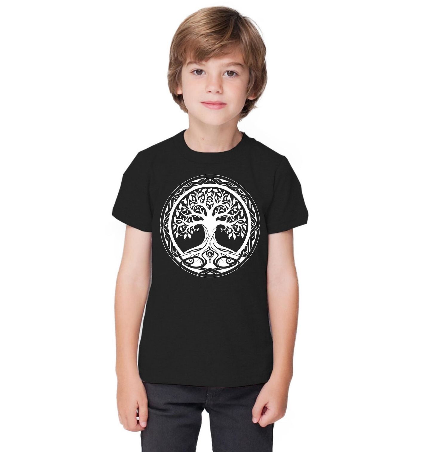 Dětské tričko Strom Života. Elegantní design zobrazuje stylizovaný strom života, známý v severské mytologii jako Yggdrasil. Tento posvátný strom propojuje světy bohů, lidí i duchů a symbolizuje rovnováhu, životní energii a propojení všech věcí.