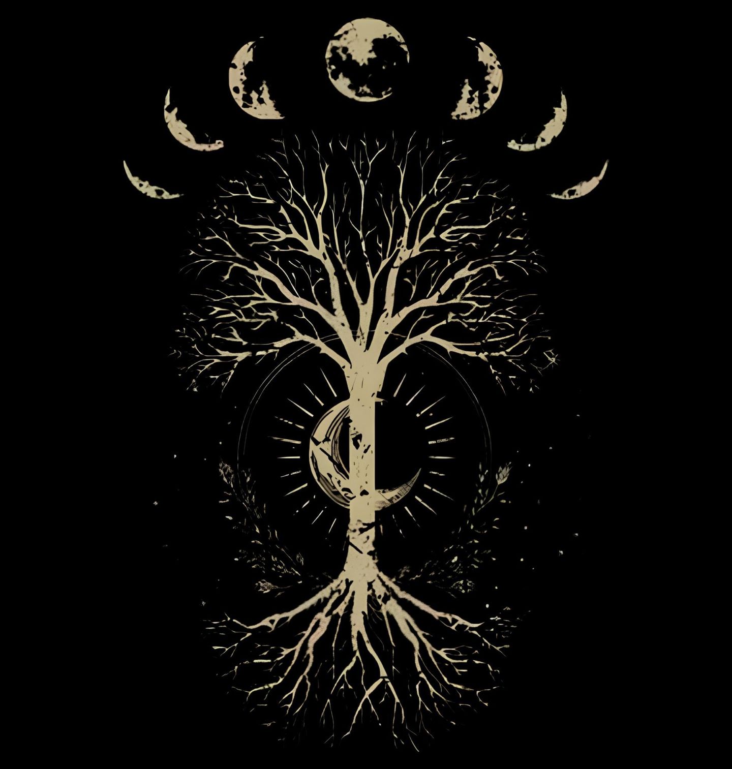 Pánské tričko Strom Života a Fáze Měsíce. Tento mystický potisk spojuje sílu přírody a vesmírný koloběh v jeden celek. Detailní strom života a lunární cyklus vytvářejí dokonalý spirituální symbol na vašem oblečení. Je to ideální volba pro každého, kdo hledá hluboký význam a originální design. Tento motiv funguje jako osobní amulet a stylový doplněk pro každý den. Ukažte své spojení s vesmírem skrze tento jedinečný kousek.