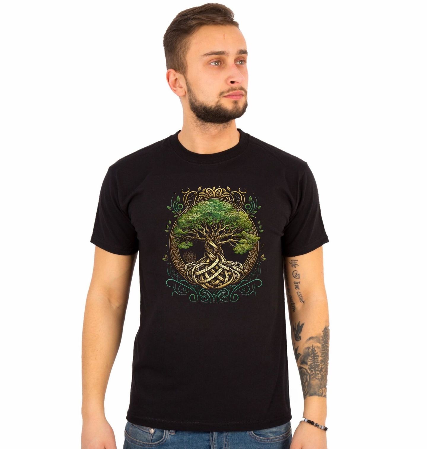 Pánské tričko Strom života Yggdrasil. Yggdrasil je posvátný strom v severské mytologii, často zobrazovaný jako mohutný jasan, který propojuje všechny světy: Asgard (svět bohů), Midgard (svět lidí), Helheim (svět mrtvých) a další říše v severském kosmu. Jeho kořeny a větve prostupují všemi úrovněmi bytí. Symbolizuje život, smrt, znovuzrození, moudrost i rovnováhu.