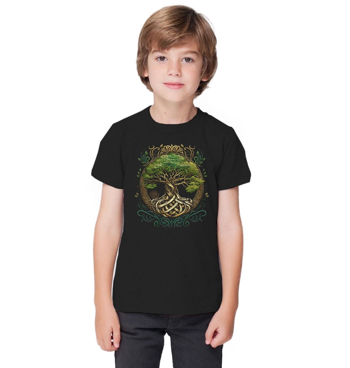Dětské tričko Strom života Yggdrasil. Yggdrasil je posvátný strom v severské mytologii, často zobrazovaný jako mohutný jasan, který propojuje všechny světy: Asgard (svět bohů), Midgard (svět lidí), Helheim (svět mrtvých) a další říše v severském kosmu. Jeho kořeny a větve prostupují všemi úrovněmi bytí. Symbolizuje život, smrt, znovuzrození, moudrost i rovnováhu.
