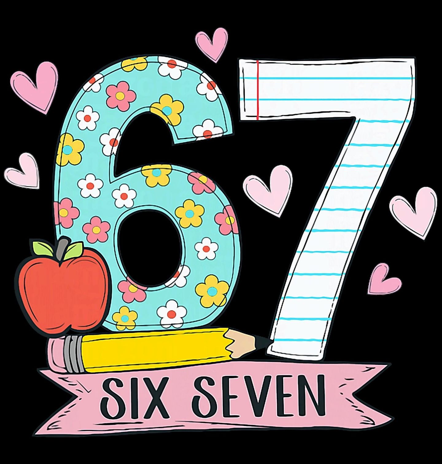 Dětské tričko Studentský Meme 67 Six Seven. Roztomilý školní motiv 67 plný kytiček, srdíček, jablka a tužky je jako stvořený pro každého, kdo je student a miluje veselý styl. Design six seven působí jako hravé meme, které ti zlepší náladu během vyučování i mimo něj. Pokud je tvoje oblíbené číslo 67, tenhle motiv ti nesmí chybět.