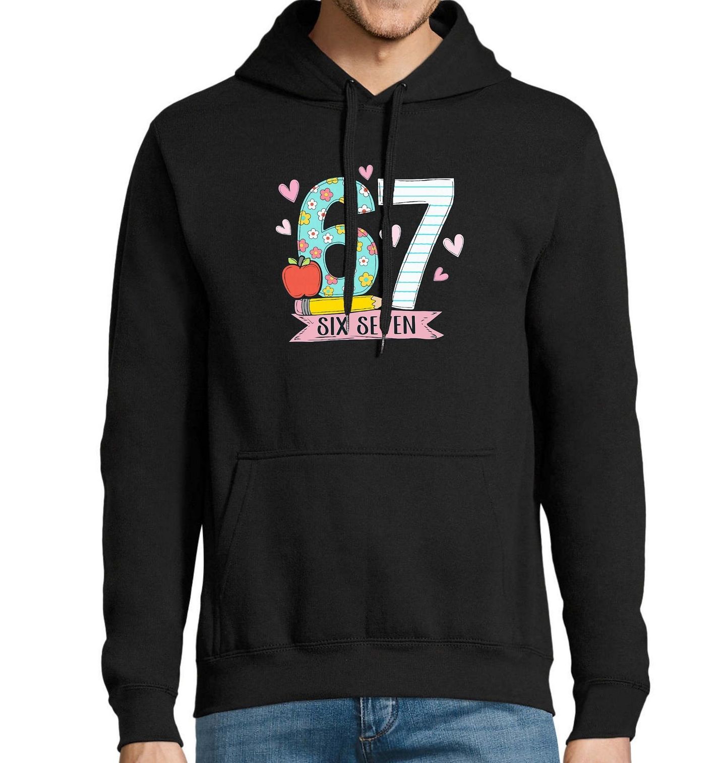 Pánská mikina Studentský Meme 67 Six Seven. Roztomilý školní motiv 67 plný kytiček, srdíček, jablka a tužky je jako stvořený pro každého, kdo je student a miluje veselý styl. Design six seven působí jako hravé meme, které ti zlepší náladu během vyučování i mimo něj. Pokud je tvoje oblíbené číslo 67, tenhle motiv ti nesmí chybět.