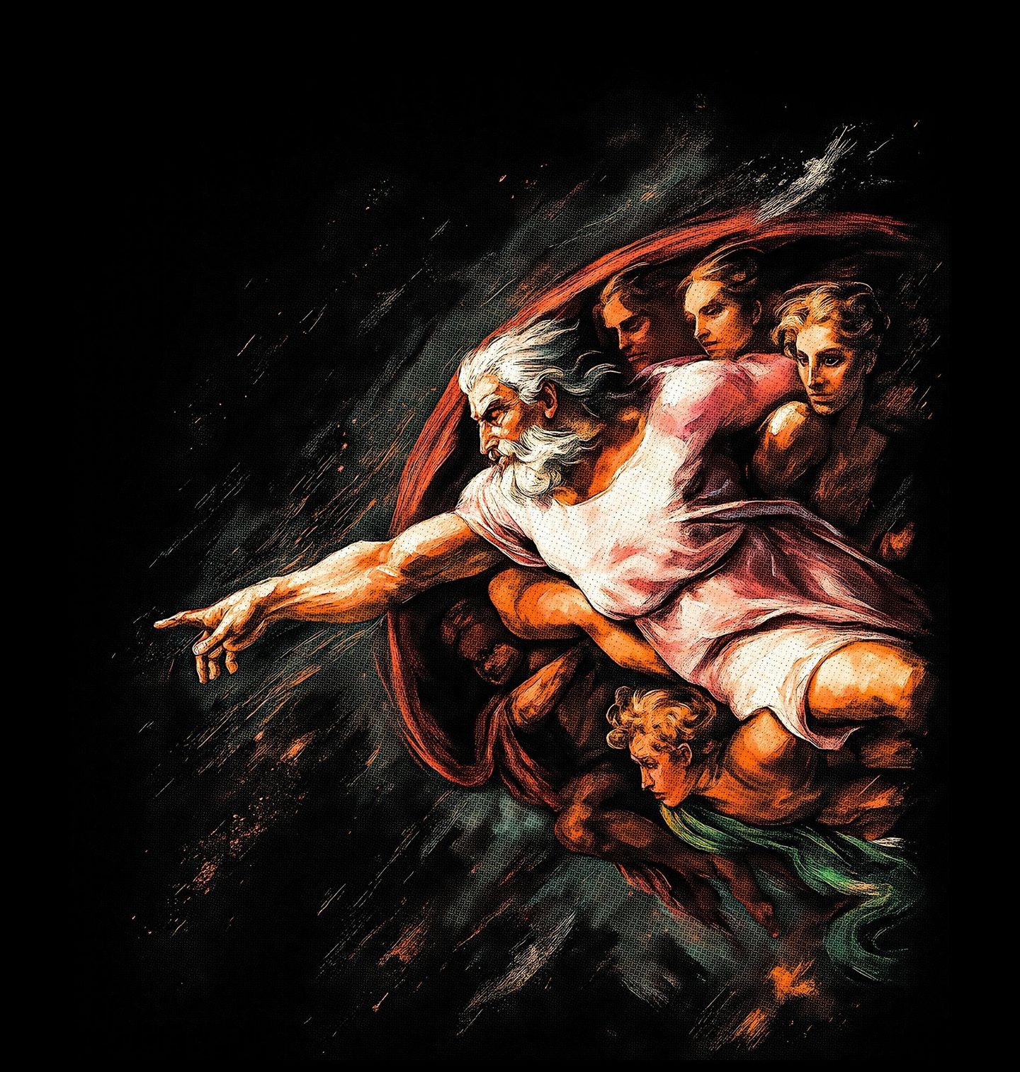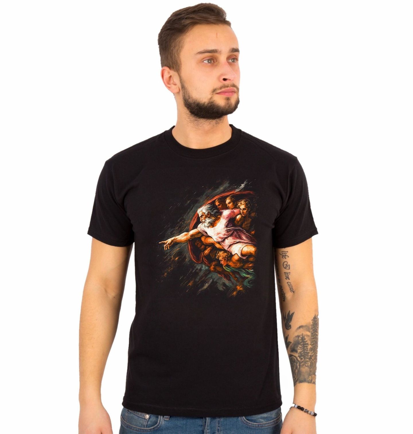 Pánské tričko Stvoření Adama Dotek života. Stvoření Adama je freska, znázorňující výjev z knihy Genesis, na stropě Sixtinské kaple ve Vatikánu. Malba vznikla v letech 1508–1512. Patří k nejvýznamnějším dílům renesančního malíře Michelangela Buonarrotiho. Postava s plnovousem je Bůh Stvořitel, obklopený andělskými bytostmi. Natáhnutá ruka symbolizuje předání života, energie a lidské existence.