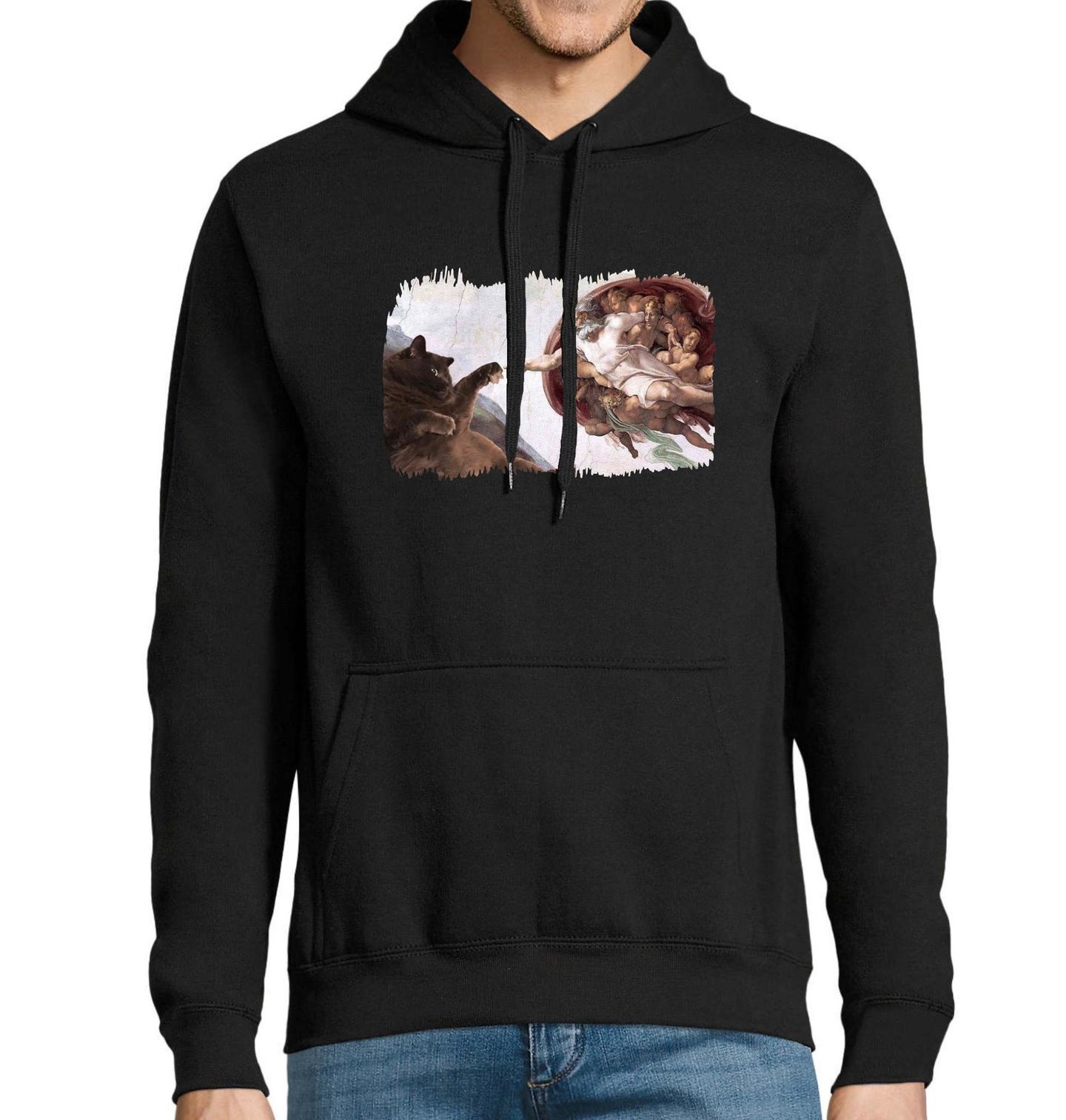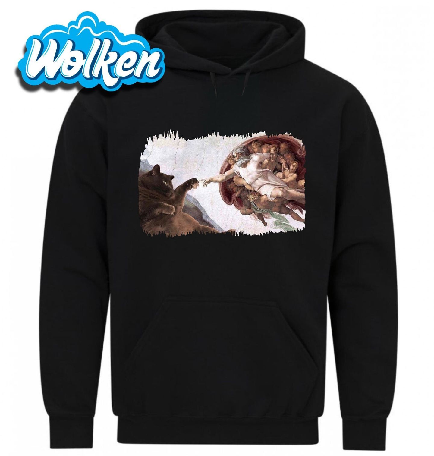 Pánská mikina Stvoření Černé Kočky. Vtipná parodie slavného obrazu Stvoření Adama od Michelangela, tentokrát s majestátní černou kočkou místo Adama. Božský dotek se mění ve šokovaný pohled kočky, která rozhodně nemá chuť spolupracovat. Umění dostává chlupatý twist – ideální pro milovníky koček, humoru a klasických děl.