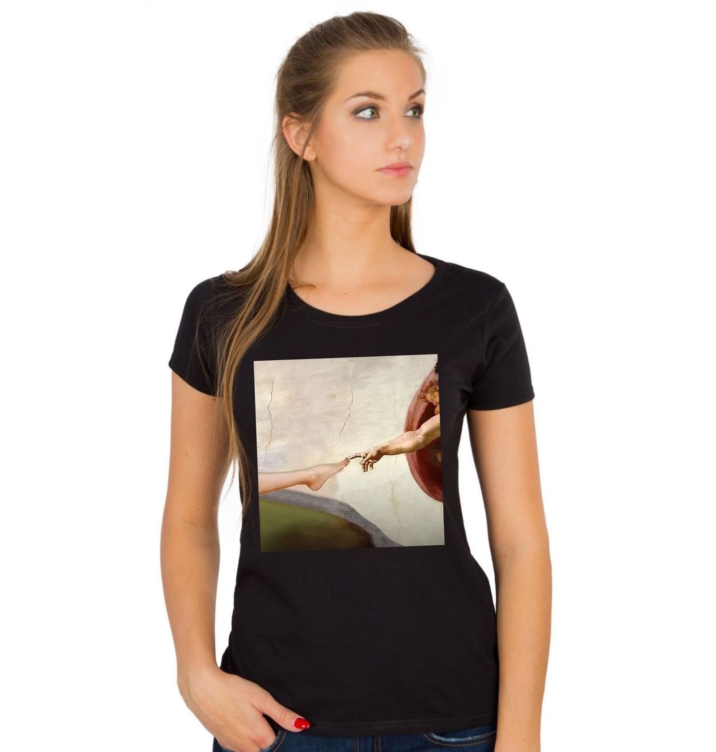 Dámské tričko Stvoření Nohy. Tento design originálně paroduje jedno z nejslavnějších děl světového malířství – Michelangelovo „Stvoření Adama“. Místo dvou rukou se zde však setkávají prsty ruky a nohy v ikonickém gestu, což dává celému výjevu nečekaný a vtipný rozměr. Potisk si zachovává jemnou estetiku fresky a renesanční barevnost, díky čemuž působí sofistikovaně a zároveň neuvěřitelně absurdně. Skvělá volba pro ty, kteří mají rádi klasické umění, ale neberou ho smrtelně vážně.