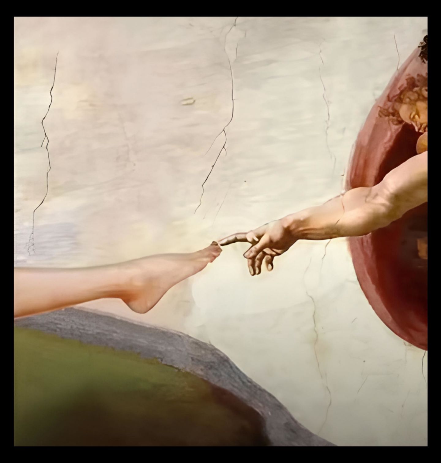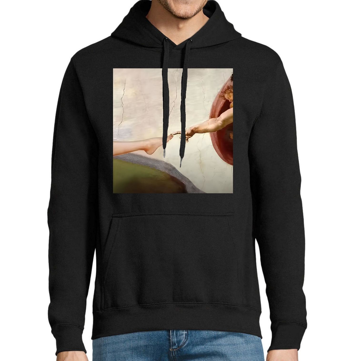 Pánská mikina Stvoření Nohy. Tento design originálně paroduje jedno z nejslavnějších děl světového malířství – Michelangelovo „Stvoření Adama“. Místo dvou rukou se zde však setkávají prsty ruky a nohy v ikonickém gestu, což dává celému výjevu nečekaný a vtipný rozměr. Potisk si zachovává jemnou estetiku fresky a renesanční barevnost, díky čemuž působí sofistikovaně a zároveň neuvěřitelně absurdně. Skvělá volba pro ty, kteří mají rádi klasické umění, ale neberou ho smrtelně vážně.