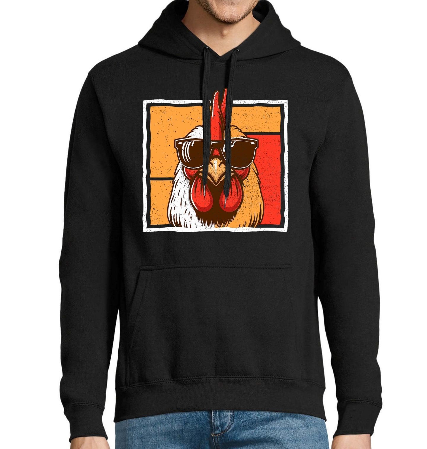 Pánská mikina Stylový Kohout s Brýlemi. Minimalistický design s výrazným kohoutem v slunečních brýlích a retro barevným pozadím působí moderně. Tento motiv zaujme svou jednoduchostí a stylovým výrazem, který se hodí pro každého, kdo má rád vintage estetiku a cool motivy.