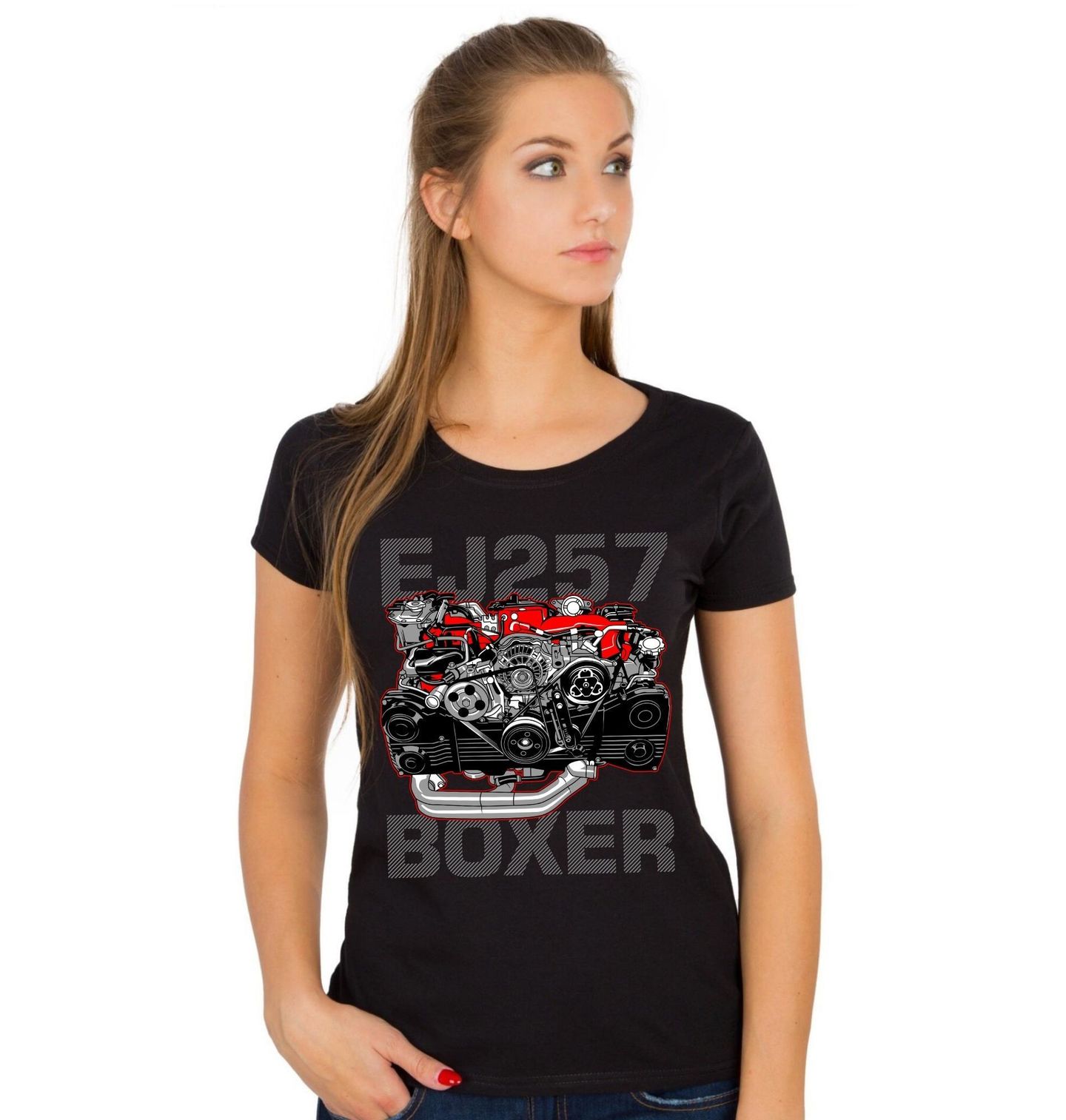 Dámské tričko Subaru EJ257 Boxer Engine. Originální motiv EJ257 Boxer přináší detailní ilustraci jednoho z nejikoničtějších japonských motorů. Tento design je ideální pro každého, kdo miluje sportovní auto, rallye styl a techniku Subaru. Grafika zobrazuje charakteristický plochý boxer motor s výraznými detaily, které ocení každý fanoušek výkonu a úprav na turbo.