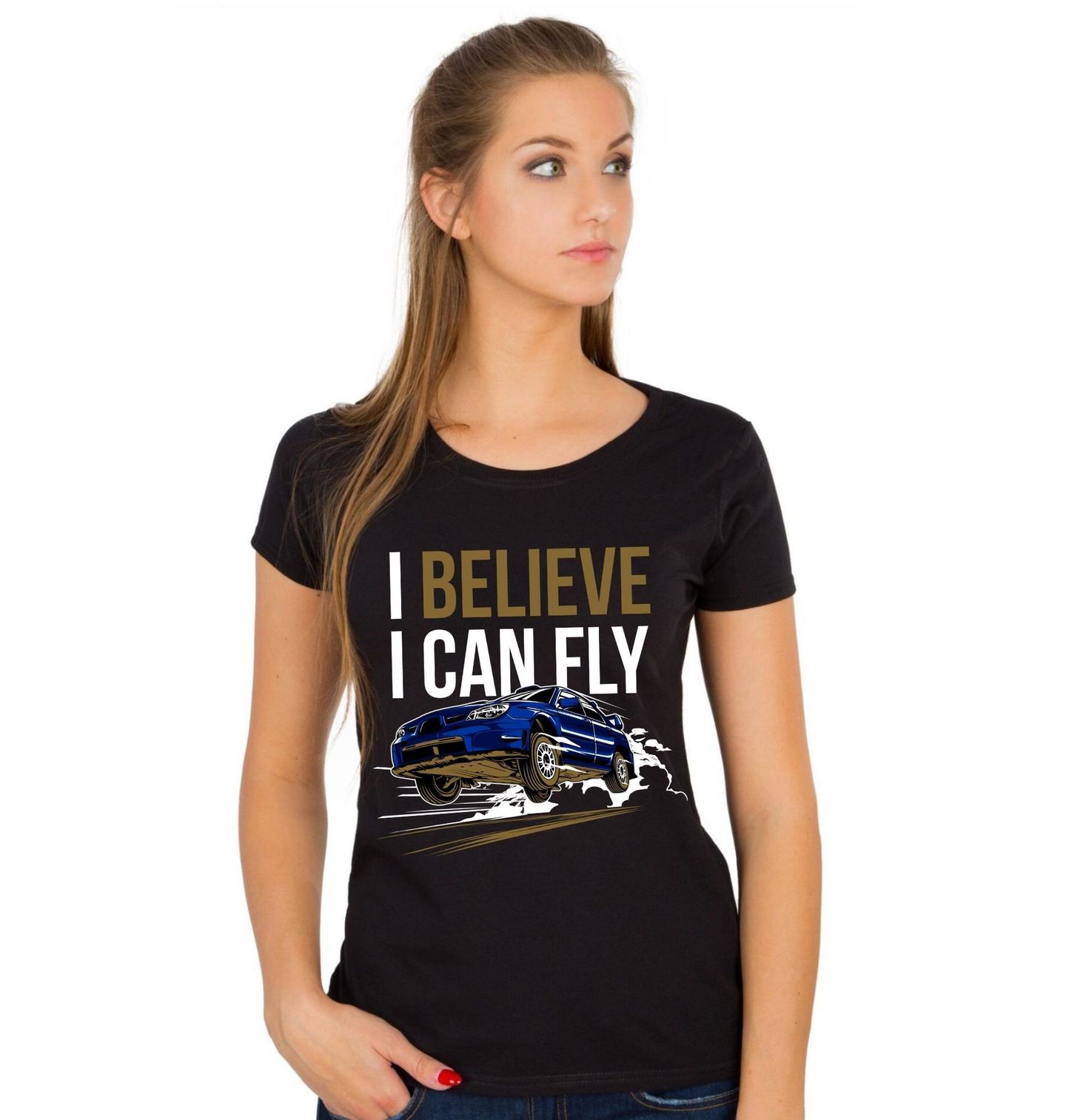 Dámské tričko Subaru Impreza I Believe I Can Fly. Na obrázku je stylizované rally auto inspirované modelem Subaru Impreza WRX STI, který je známý svými úspěchy v rally a ikonickým vzhledem. Motiv se hodí pro milovníky rychlé jízdy, JDM kultury a fanoušky motorsportu, kteří chtějí nosit kus atmosféry Japonsko silnic a závodních tratí.