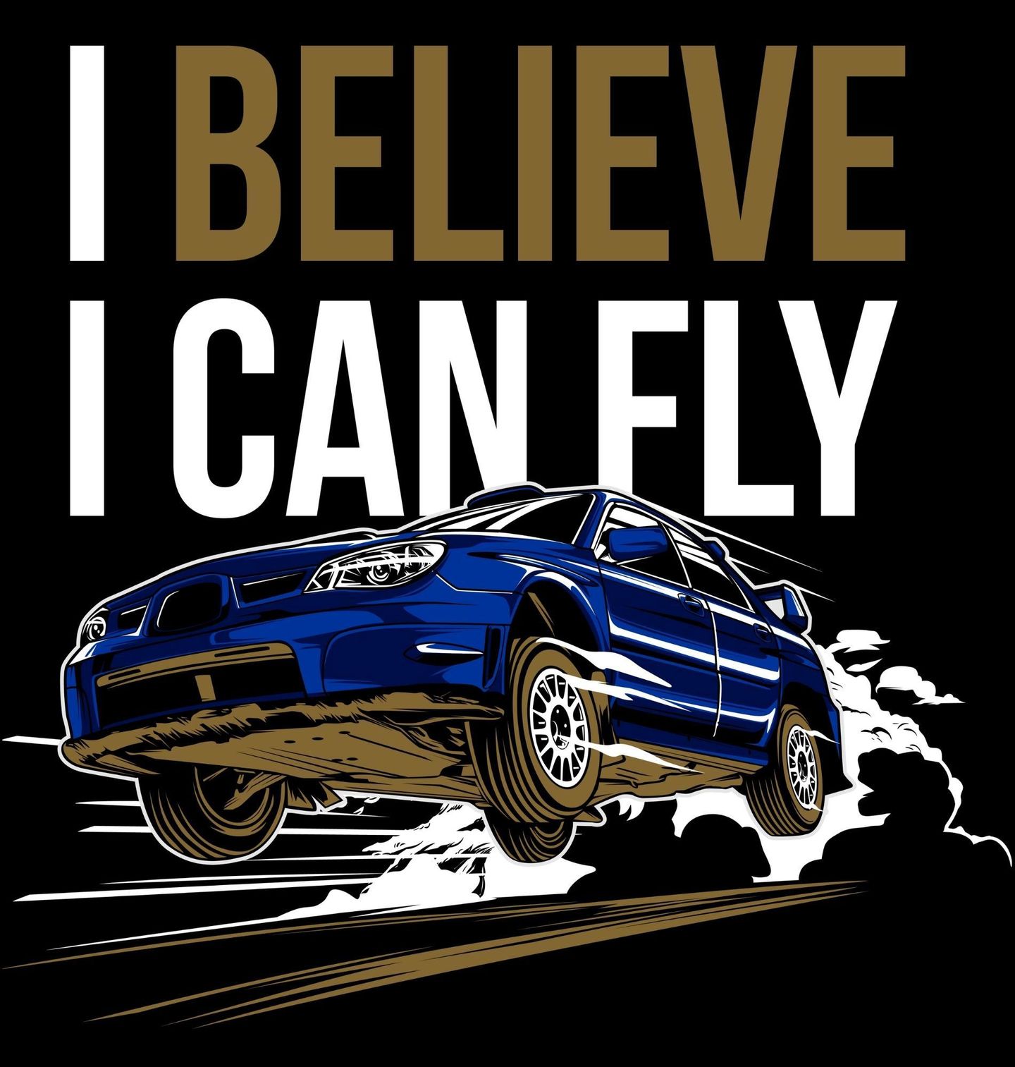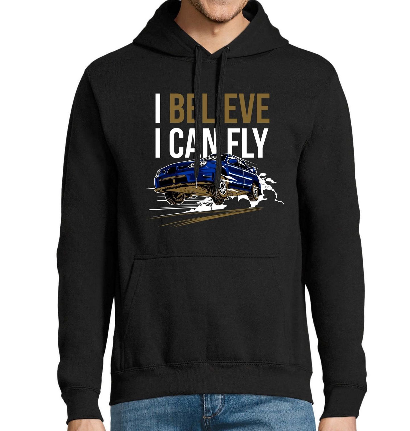 Pánská mikina Subaru Impreza I Believe I Can Fly. Na obrázku je stylizované rally auto inspirované modelem Subaru Impreza WRX STI, který je známý svými úspěchy v rally a ikonickým vzhledem. Motiv se hodí pro milovníky rychlé jízdy, JDM kultury a fanoušky motorsportu, kteří chtějí nosit kus atmosféry Japonsko silnic a závodních tratí.
