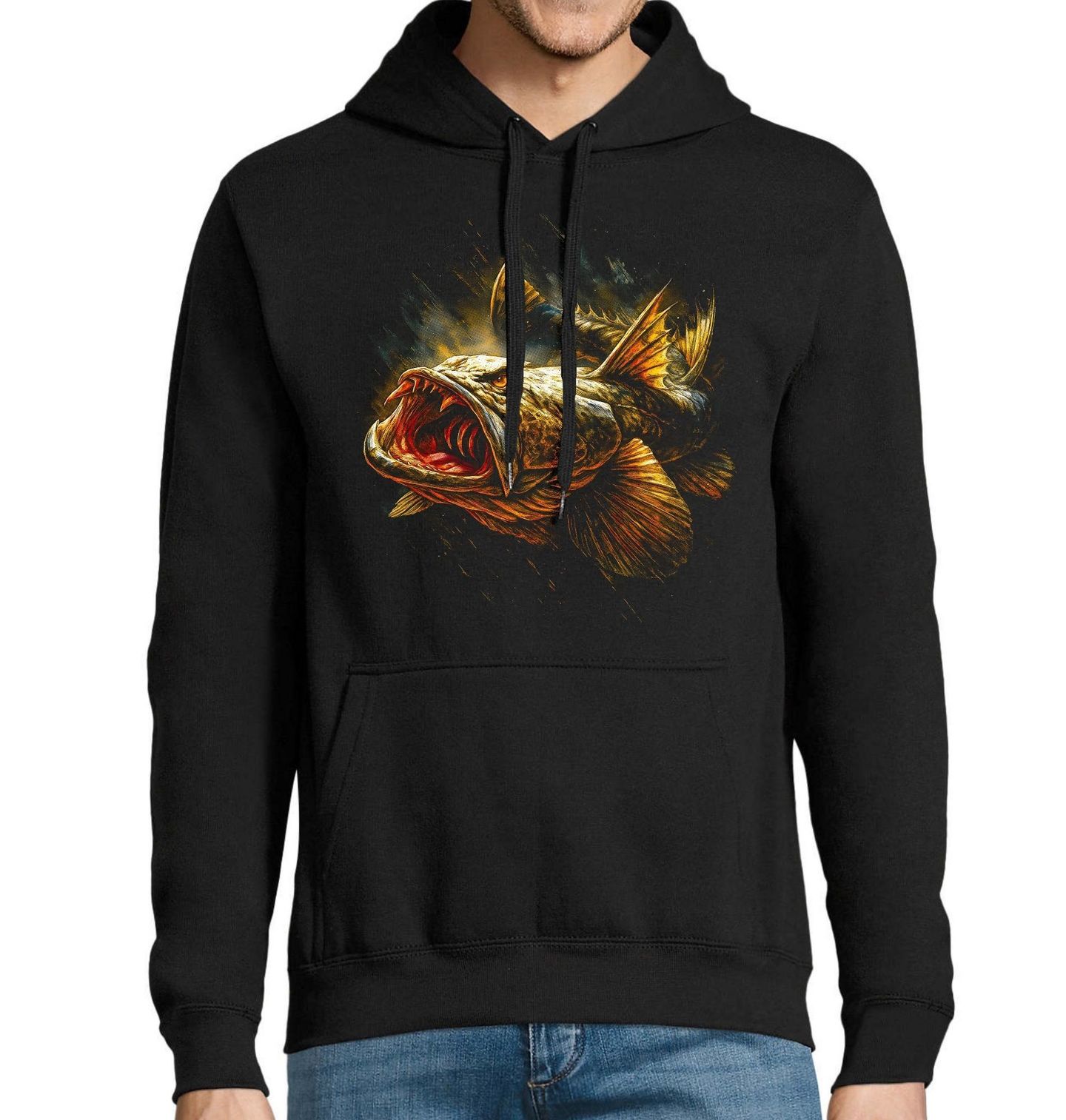 Pánská mikina Sumeček plochohlavý. Tento výrazný motiv zobrazuje sumečka plochohlavého, mohutného dravce sladkých vod, který je známý svou silou, agresivitou a nočním způsobem lovu. Rybaření na sumečka patří mezi největší výzvy, které může rybář zažít – vyžaduje trpělivost, správnou techniku a respekt k protivníkovi.