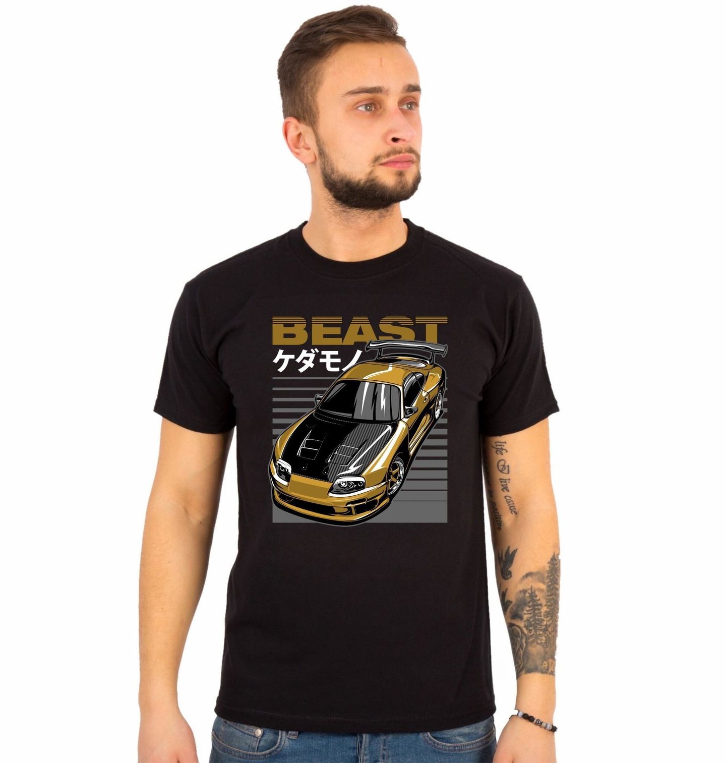 Pánské tričko Supra MK4 BEAST. Motiv je inspirovaný legendárním japonským sportovním vozem Toyota Supra MK4 (A80). Poznat ho lze podle typických předních světlometů, širokého bodykitu a výrazného zadního křídla. Zlatá karoserie, karbonová kapota a agresivní aerodynamické prvky dodávají motivu sílu a charakter, který ocení každý fanoušek JDM stylu.