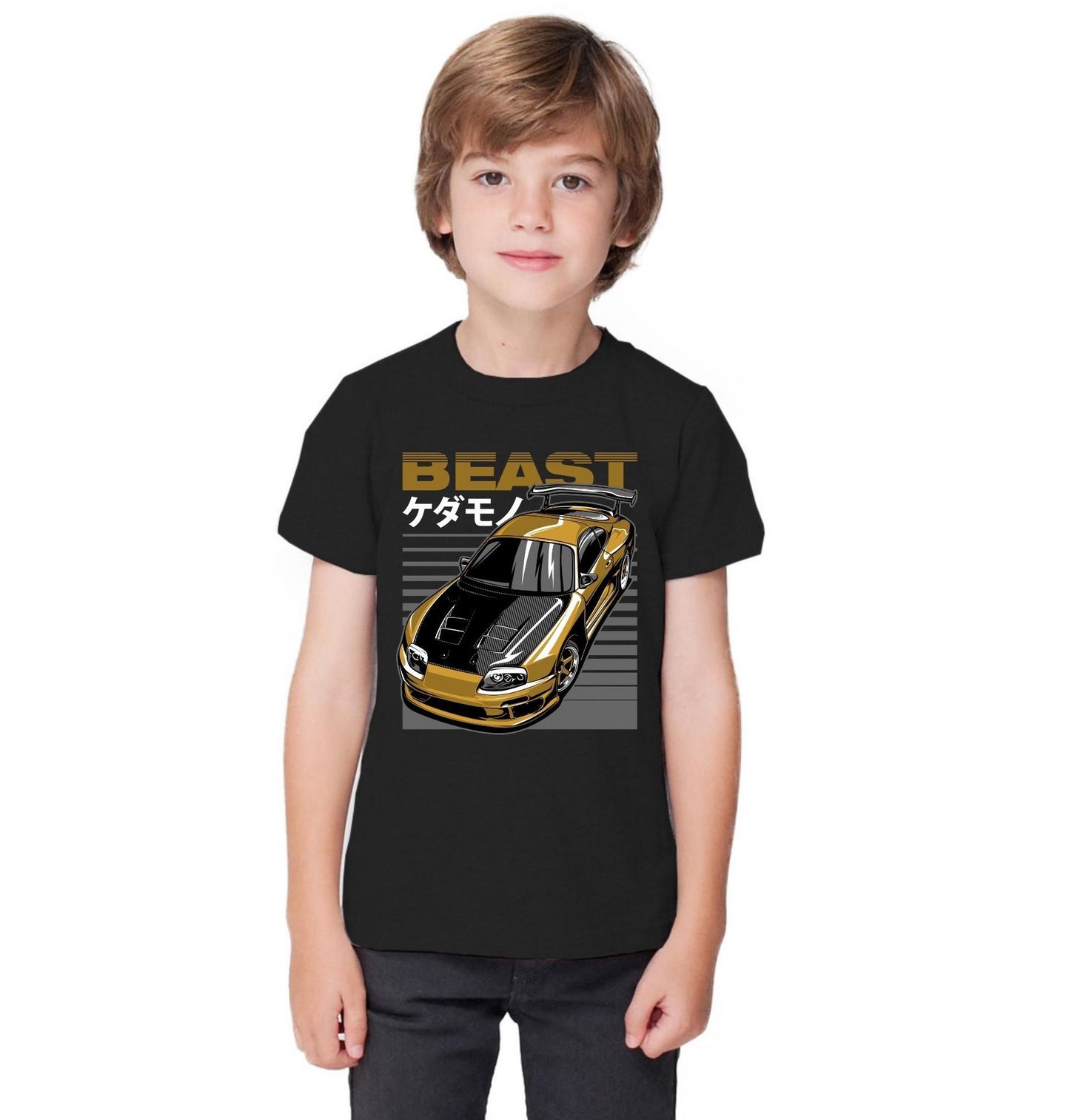 Dětské tričko Supra MK4 BEAST. Motiv je inspirovaný legendárním japonským sportovním vozem Toyota Supra MK4 (A80). Poznat ho lze podle typických předních světlometů, širokého bodykitu a výrazného zadního křídla. Zlatá karoserie, karbonová kapota a agresivní aerodynamické prvky dodávají motivu sílu a charakter, který ocení každý fanoušek JDM stylu.