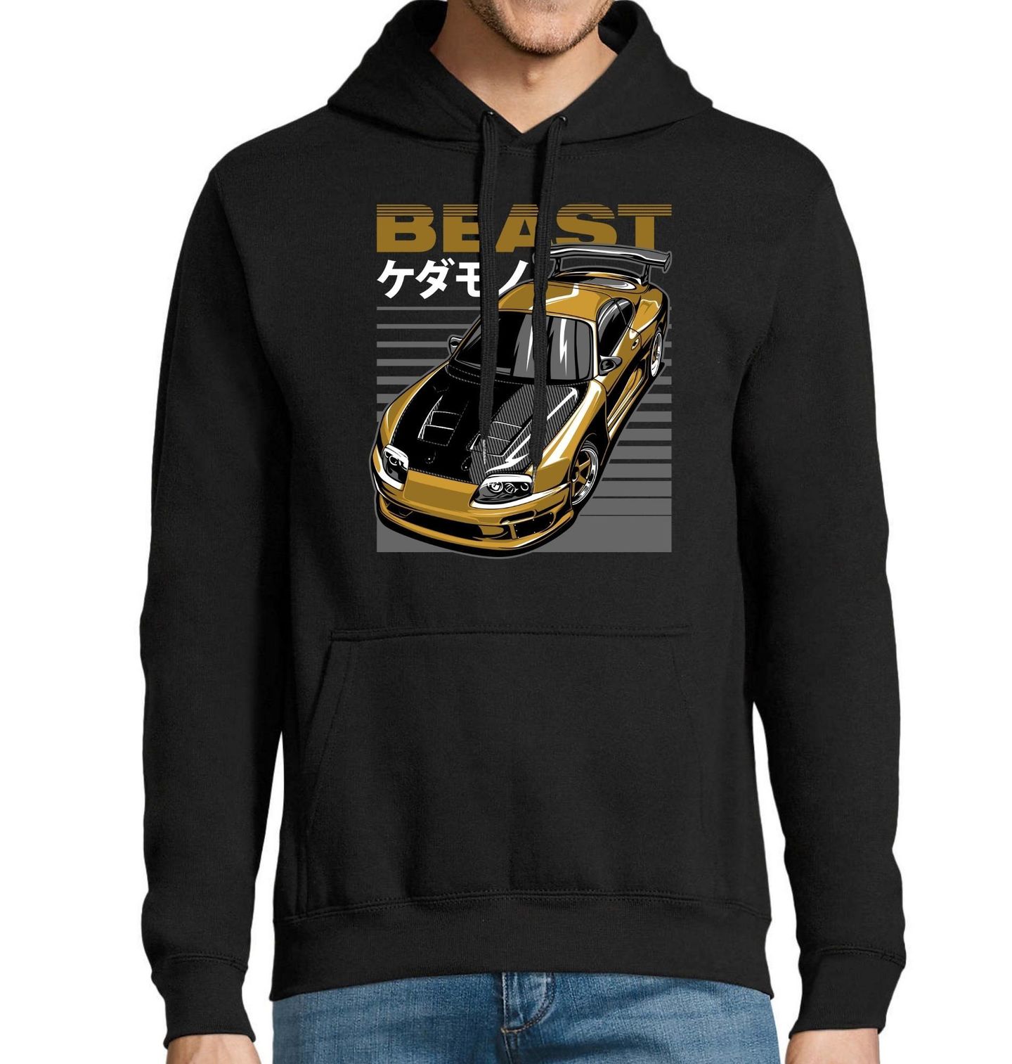 Pánská mikina Supra MK4 BEAST. Motiv je inspirovaný legendárním japonským sportovním vozem Toyota Supra MK4 (A80). Poznat ho lze podle typických předních světlometů, širokého bodykitu a výrazného zadního křídla. Zlatá karoserie, karbonová kapota a agresivní aerodynamické prvky dodávají motivu sílu a charakter, který ocení každý fanoušek JDM stylu.